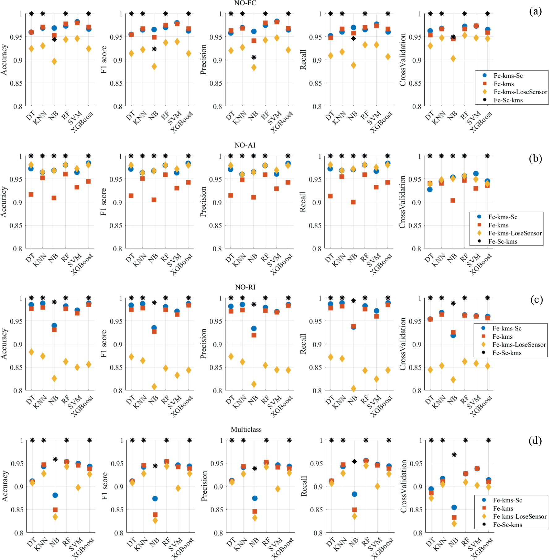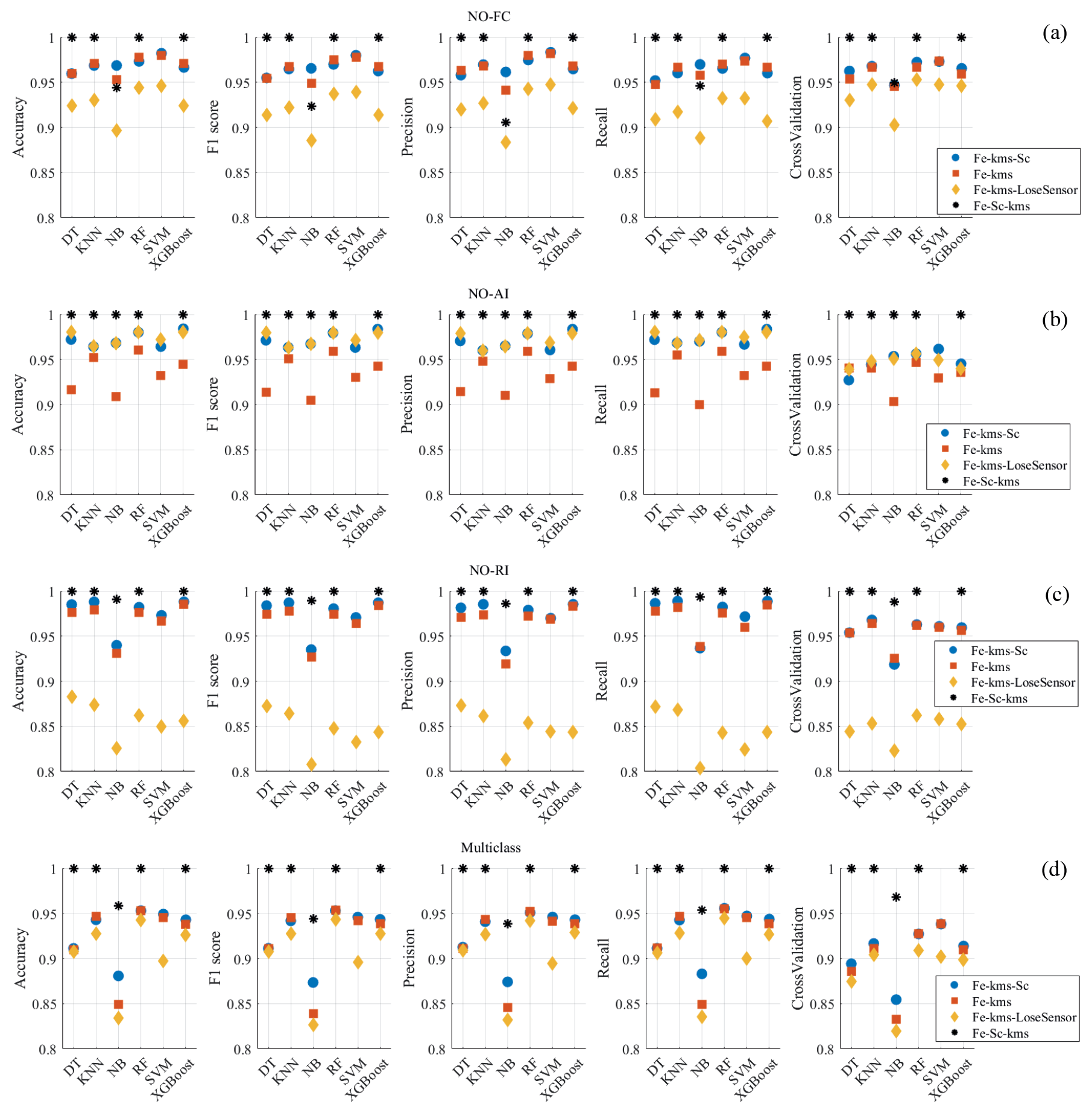 Figure 10Comparison of the metrics (accuracy, F1-score, precision, recall, and cross-validation) for the six ML algorithms and each arranged final dataset. (a) Binary NO-FC, (b) binary NO-AI, (c) binary NO-RI, and (d) multi-class failure study cases.