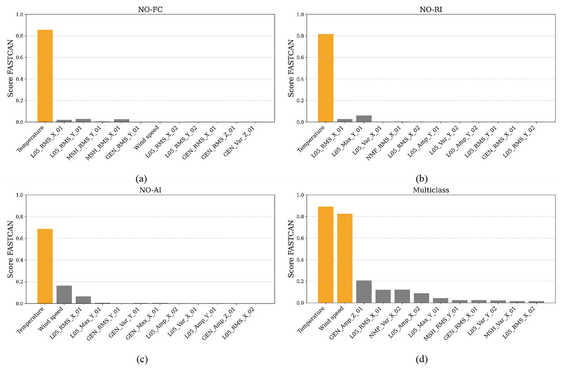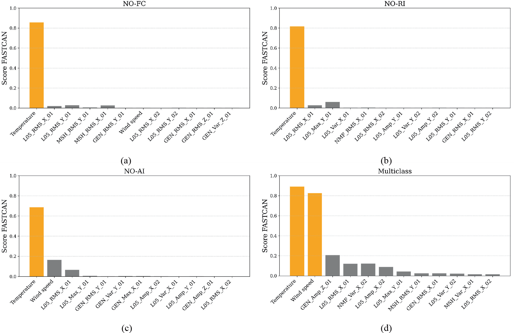 Figure 8Sensor score based on the top-performing features of each operational condition: (a) NO-FC, (b) NO-AI, (c) NO-RI, and (d) multi-class.