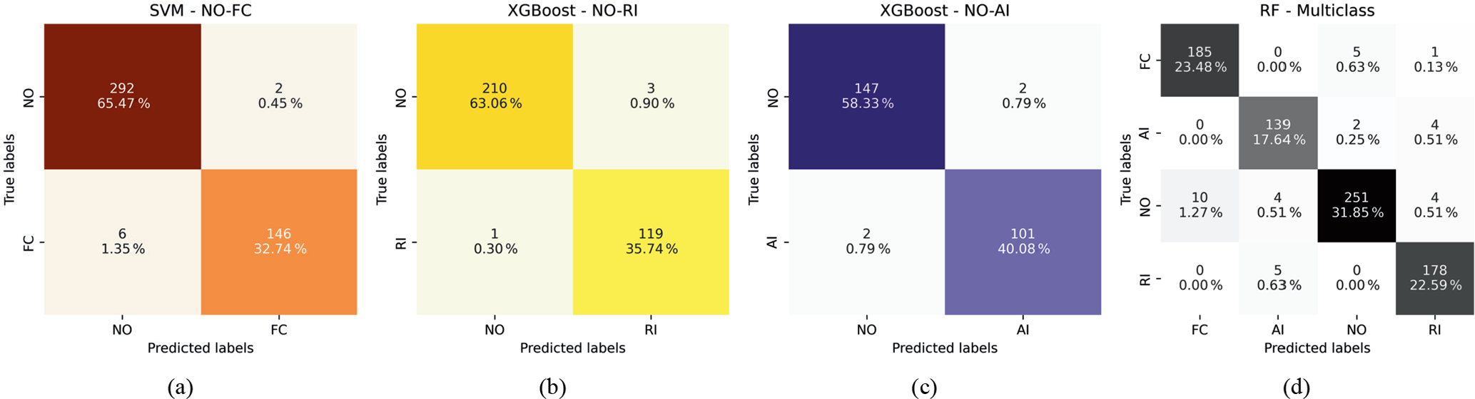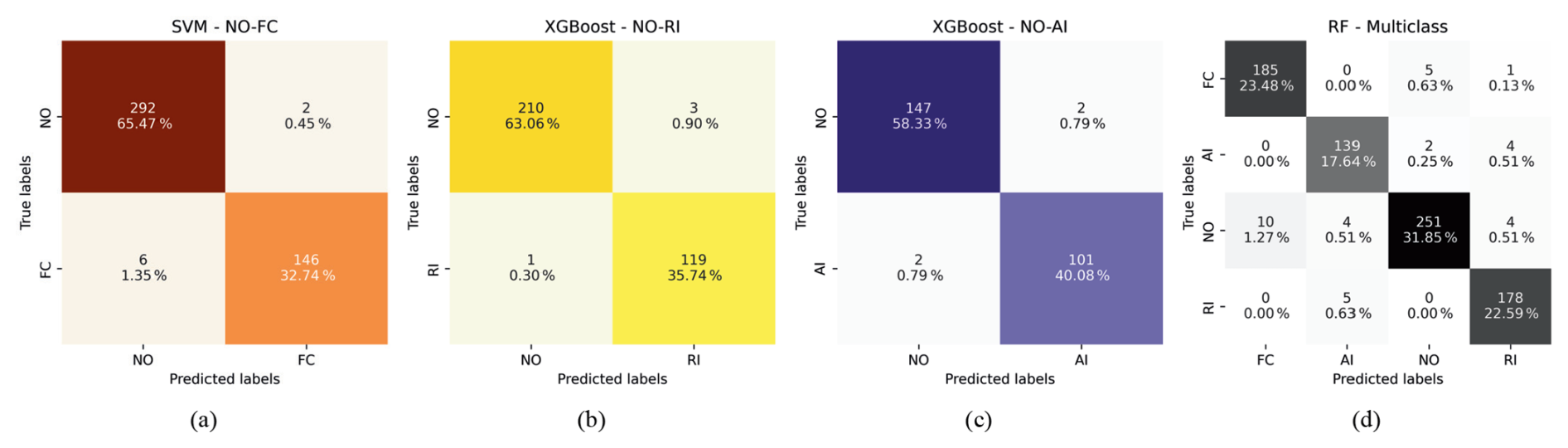 The confusion matrices shown in Fig. 12a–c present the results of binary classification using the respective best-performing ML algorithms using the Fe-kms-Sc dataset. In the NO-FC case, the SVM model achieved optimal accuracy and cross-validation, correctly classifying 292 samples as NO (65.47 %) and 146 as FC (32.74 %). For the NO-RI classification, the XGBoost model correctly classifies 210 samples as NO (63.06 %) and 119 as RI (35.74 %). In the NO-AI scenario, the XGBoost model outperformed the others, correctly classifying 101 samples as AI (40.08 %) and 147 as NO (58.33 %). Figure 12d displays the confusion matrix for the multi-class classification involving AI, FC, NO, and RI. The RF model correctly identified 139 samples as AI (17.64 %), 185 as FC (23.48 %), 178 as RI (22.59 %), and 251 as NO (31.85 %).