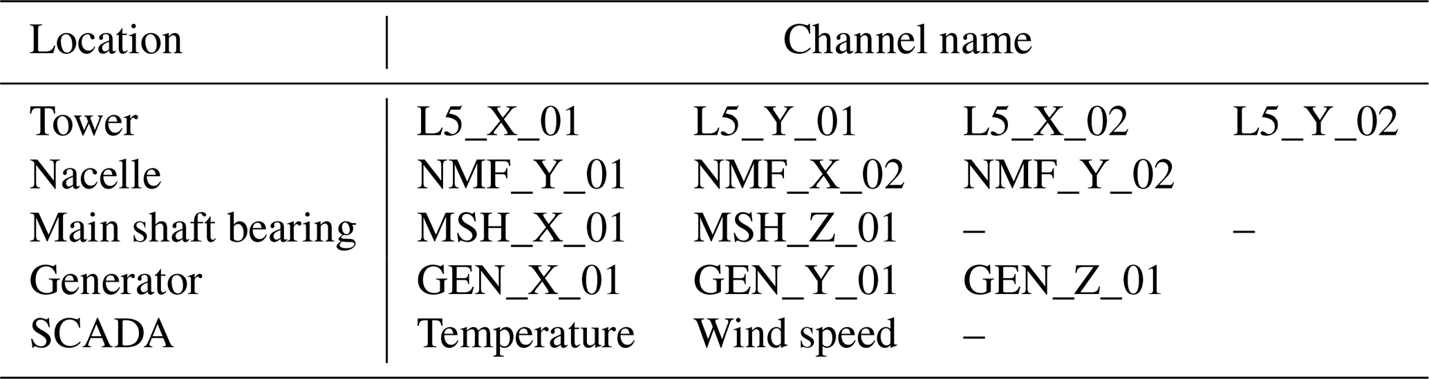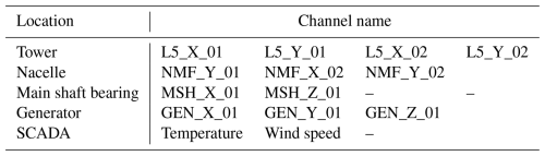 Table 1Information on SCADA data and accelerometers used in the monitoring, with the respective sensor channel and location.