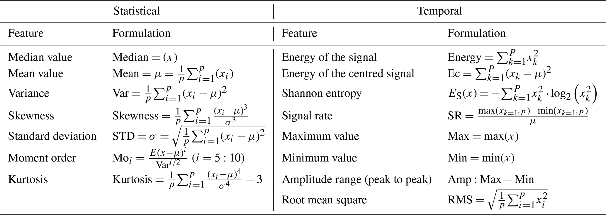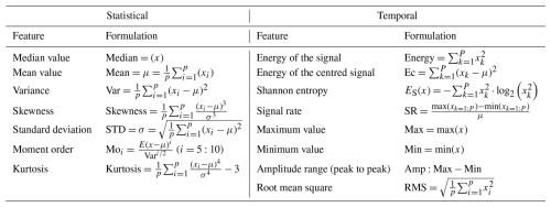 Feature selection involves choosing a subset of variables from the original dataset. This step transforms the spectrum data into new variables to create a refined dataset (Bishop, 2006). Fifteen features are formulated using the time-domain signal (Knittel et al., 2019; Barreto et al., 2021; Ashkarkalaei et al., 2025a), as presented in Table 2, where x is the temporal spectrum signal and p is the sampling points value.