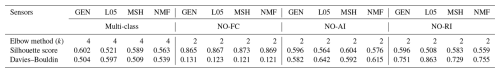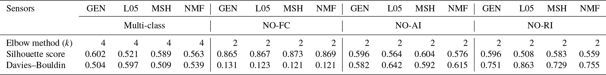 Table 3k-means clustering identification for each sensor related to the failure associated with the silhouette coefficient and Davies–Bouldin index performance metrics.