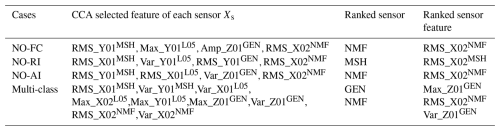 From the two correlated feature groups, four representative features (RMS, maximum, variance, and amplitude range) were selected to compose the global dataset. Those four features were chosen over the other in their respective group due to near-equivalence, thus avoiding redundancy. The initial global dataset, therefore, consisted of the four selected features extracted from each sensor axis, resulting in a structure of measurement_rows × 48 columns, plus the SCADA data, as detailed in Table 1. However, including all these features may appear arbitrary and degrade model performance due to their high similarity. To refine the global dataset, a canonical correlation analysis was applied to identify the most sensitive features for each sensor, accounting for all axes simultaneously within the sensor group. The highest feature correlation scores were selected, reducing the dataset to four representative features plus SCADA. This process yielded the final datasets: the binary classification dataset has six columns (four features plus SCADA), and the multi-class dataset has nine columns (selected features plus SCADA). Identifying the most informative sensor is also relevant, as it indicates which sensor contributes most to classification accuracy and provides resilience in the event of sensor loss. To validate this study, the most sensitive feature from the best-performing sensor was removed in subsequent tests, thereby demonstrating the robustness and consistency of the proposed feature selection strategy. Feature and sensor selection are detailed in Sect. 2.1.