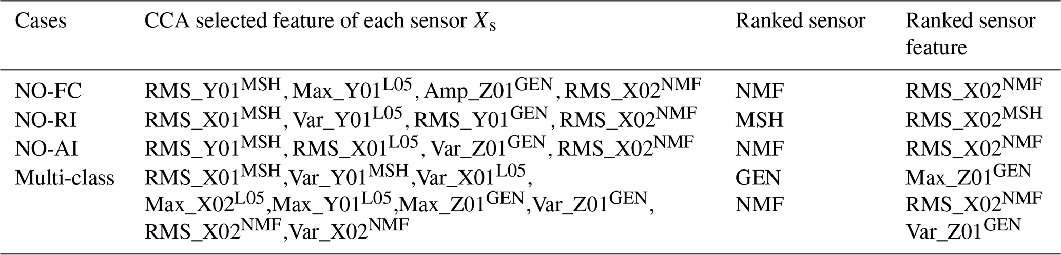 Table 5Description of the sensitive feature of each sensor (Xs) and an indication of the most sensitive sensor of each failure case.