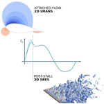 As per common practice, the raw lift and drag coefficients were first manually cleaned by removing inaccurate/unconverged results, generally close to or after the positive or negative stall points. Clean coefficients were then extrapolated to the full ±180° angle of attack range using empirical post-stall correlations. Differently from other studies, special attention was given to the extrapolation process. In particular, the choice and calibration of the post-stall extrapolation method were driven by dedicated scale-resolving stress-blended eddy simulations (SBESs), which were carried out for the FFA-W3-241 airfoil at a Reynolds number of 10×106 and selected angles of attack (see Fig. 11).