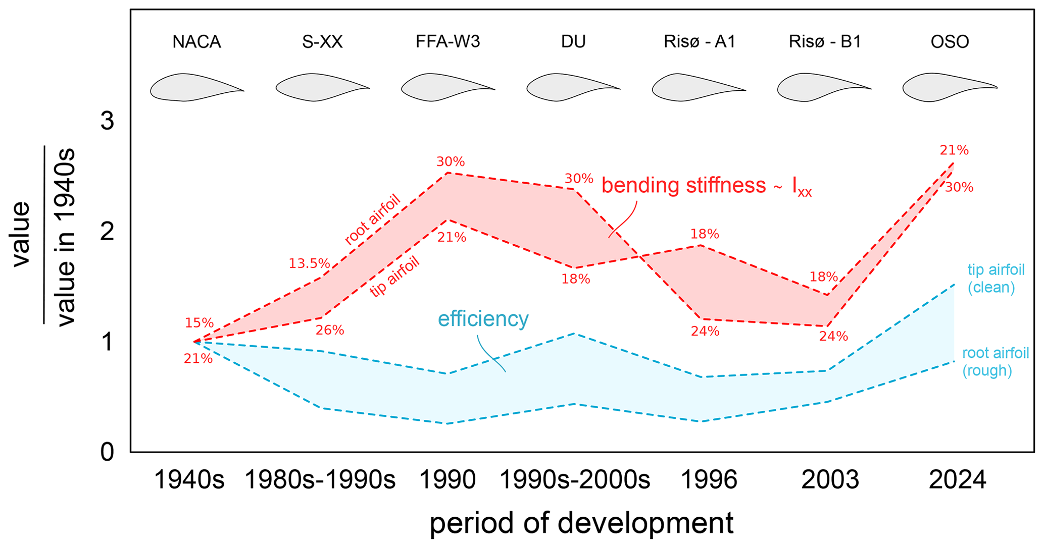 Figure 1Historical evolution of airfoil families for wind turbine design in terms of design balance between aerodynamic efficiency and structural bending stiffness, assumed to be proportional to the flapwise sectional moment of inertia. The performance envelope represents the range between tip (clean) and root (rough) profiles for each family depending on the availability of public data: NACA 63-415/63(4)421 (Bertagnolio et al., 2001), NREL S801/S815 (Ramsay et al., 1996), FFA-W3 211/301 (Andres, 1990), DU 96-W-180/97-W-300 (Timmer and Rooij, 2003), Risø A1-18/24 (Fuglsang et al., 1999), Risø B1-18/24 (Fuglsang et al., 2003), and OSO 21/30 (Karcher et al., 2025). Percentages refer to relative thickness of the selected root and tip airfoils.