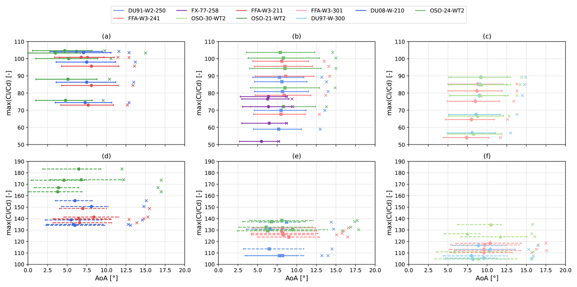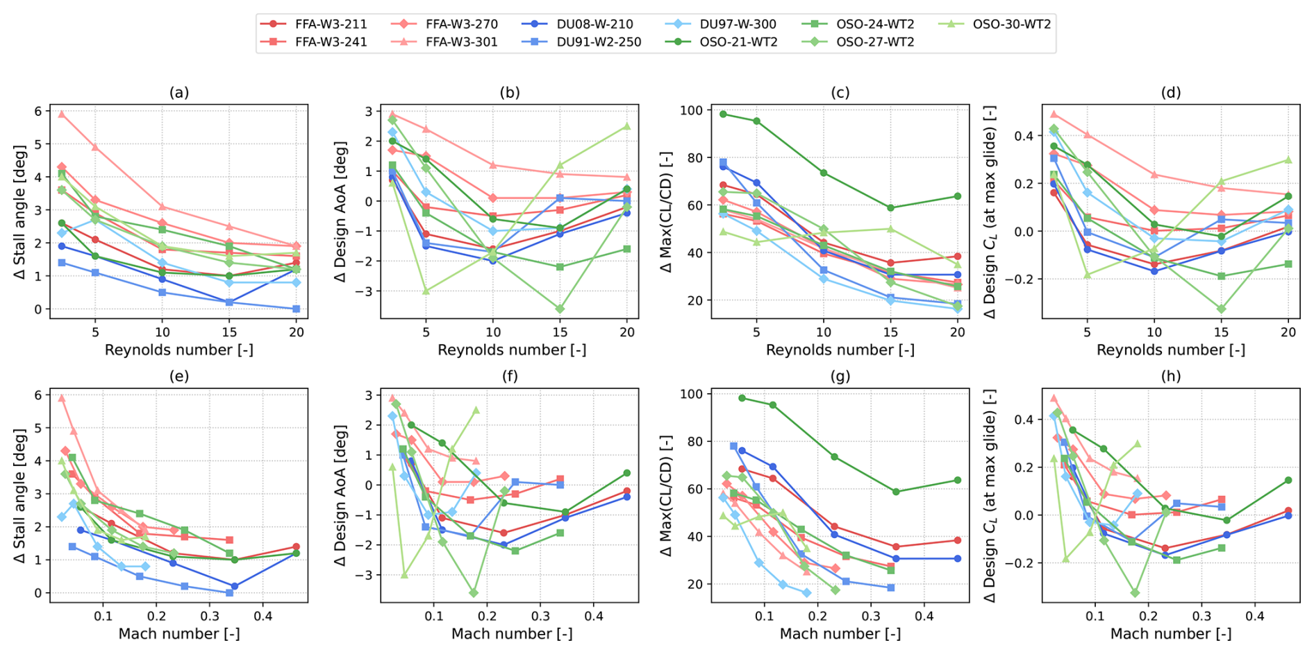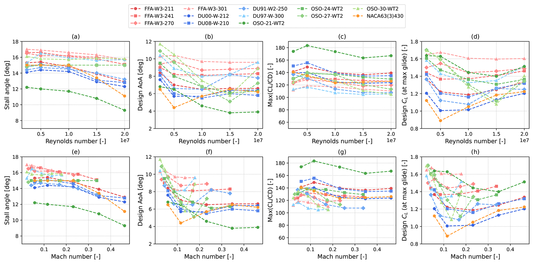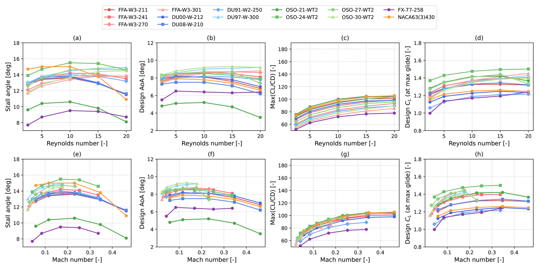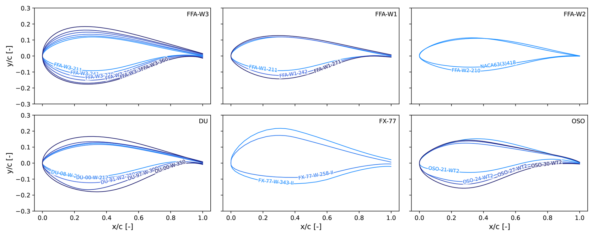 The dataset analyzed herein contains airfoil coefficients with varying Reynolds and Mach numbers of several open-access commonly used wind turbine airfoils. The dataset includes the FFA-W1, FFA-W2, FFA-W3, DU, FX77, and OSO airfoil families. One notable exception amongst open-access airfoils is represented by NREL S-series airfoils (Tangler and Somers, 1995), as they are relatively slender for modern blade designs. In fact, only airfoils with thickness-to-chord ratios greater than 21 % are included in the dataset. The NACA63(3)418 airfoil is included despite featuring a relative thickness of 18 % as it has been used in recent actual wind turbine blades (Braud et al., 2025). The full list of geometries is shown in Fig. 2 and is summarized in Table 1.