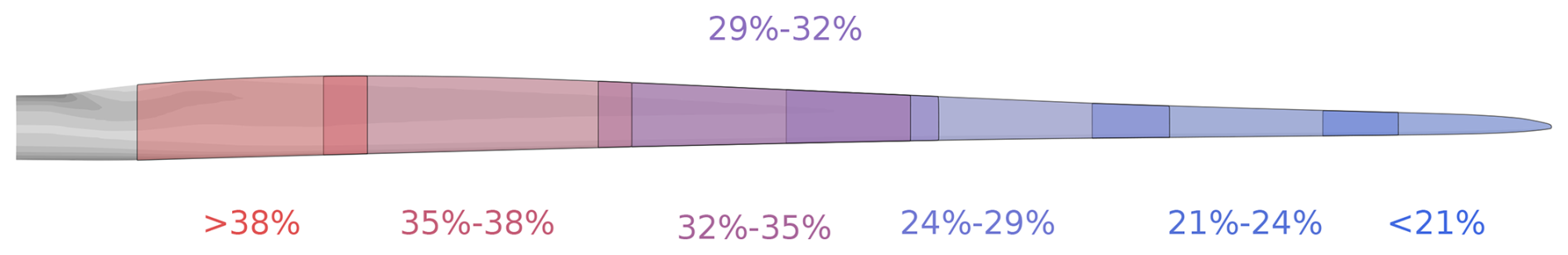 Figure 3Assumed range of relative thickness as a function of blade span on the IEA 22 MW blade.