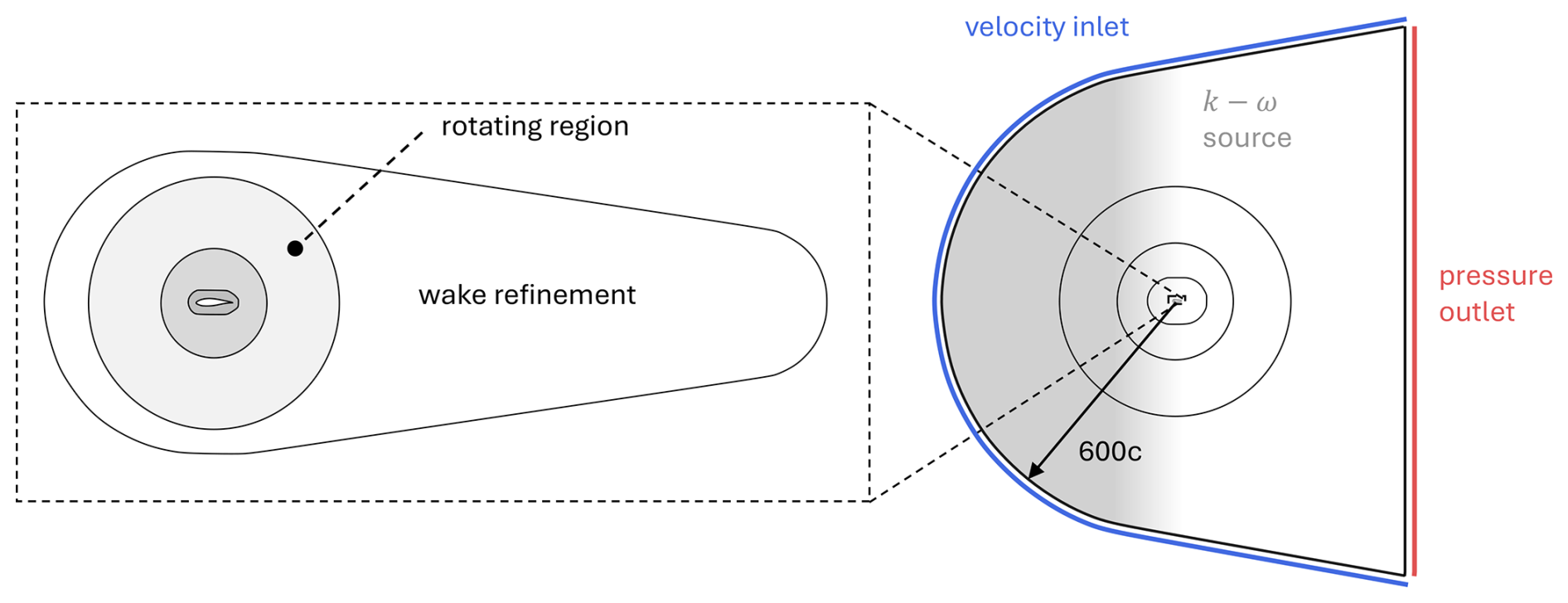 An open-field, bullet-shaped domain is used as shown in Fig. 4. This geometry allows for the use of a single inlet boundary, where inflow velocity, turbulence intensity, and length scale are specified, and a single outlet boundary, where the free-stream pressure is imposed. The domain boundaries are placed 600 chords away to avoid interference with the pressure distribution on the airfoil, as discussed in more detail in Sect. 3.1, while also allowing the airfoil's wake to fully develop. The angle of attack is changed by rotating the airfoil inside the domain via a sliding interface. While not presently included in this dataset, this approach also allows for dynamic simulations to be performed. The kω SST turbulence closure (Menter, 1994) is used in fully turbulent simulations. The numerical decay of turbulence from the inlet to the airfoil is prevented using ad hoc source terms in the k and ω transport equations: this avoids artificially large length scales and consequent contamination of the solution in non-turbulent regions due to excessive eddy viscosity (Spalart and Rumsey, 2007). Boundary layer transition in the free transition simulations is modeled using the four-equation γReθ transition model (Langtry and Menter, 2009; Menter et al., 2004). In order to fine-tune the characteristics of the transition model, the correlation developed by Drela (1998) for the transition-critical Reynolds number is used, as explained in more detail in Sect. 3.2.