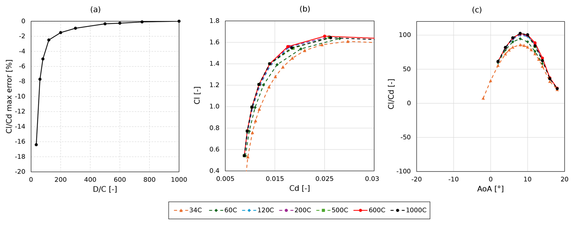 Figure 5Relative error in maximum aerodynamic efficiency with respect to the largest tested domain (a), lift coefficient as a function of drag coefficient (b), and lift-to-drag ratio as a function of the angle of attack (c) with various domain sizes. Domain size is expressed as a function of the chord (C).