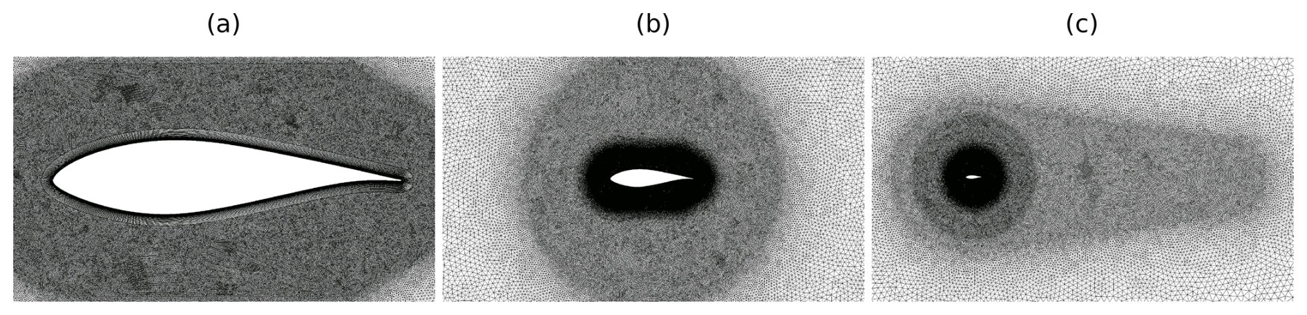 Figure 6Triangular mesh used in computations. (a) Wake refinement and rotating region around the blade, (b) blade refinement, and (c) boundary layer mesh.