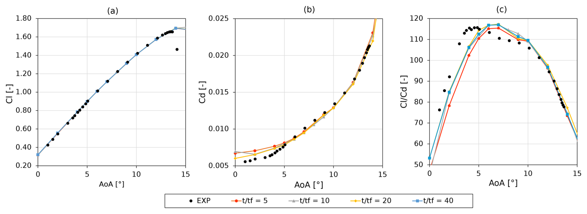 Figure 8Lift coefficient (a), drag coefficient (b), and lift-to-drag ratio (c) as a function of the angle of attack with varying time step sizes. Reynolds number of 15×106 and turbulence intensity of 0.34 %. Time step is expressed as a fraction of the through-flow time (Eq. 4). Reference data from Ozlem et al. (2017).