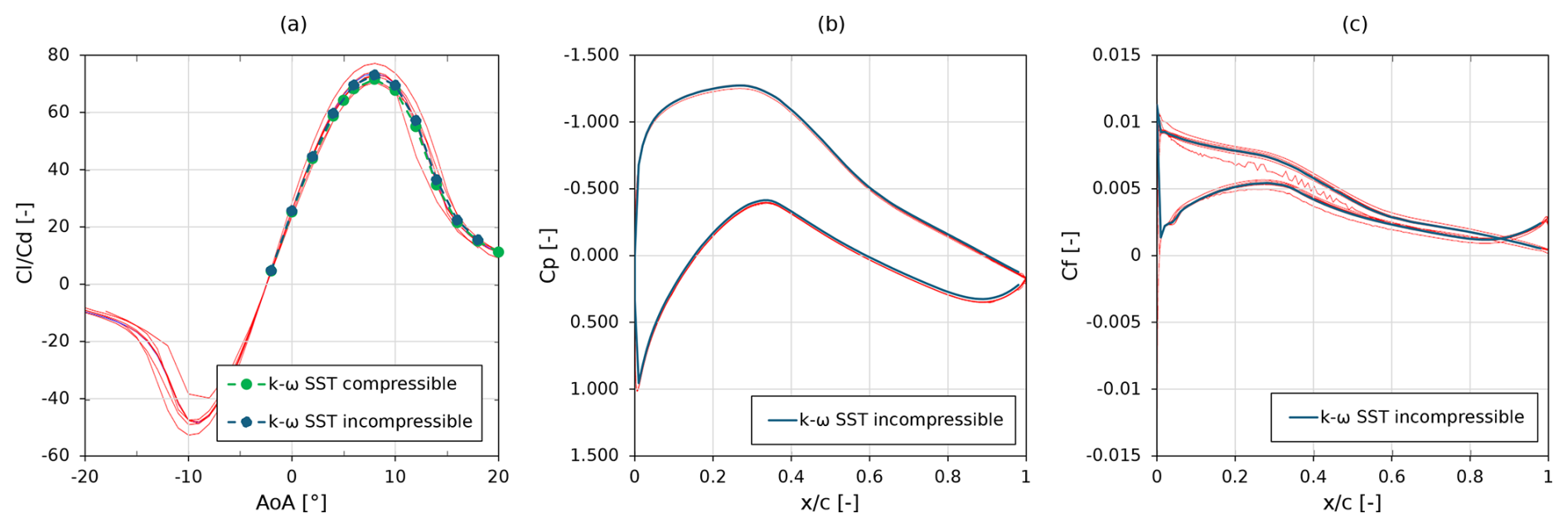 Figure 9Lift-to-drag ratio as a function of the angle of attack (a) and pressure coefficient (b) and friction coefficient (c) as functions of the chordwise position. Reynolds number of 15×106, turbulence intensity of 0.34 %, and Mach number of 0.075. Reference data in red from Sørensen et al. (2016) show the spread in model prediction that was found during the AVATAR project.
