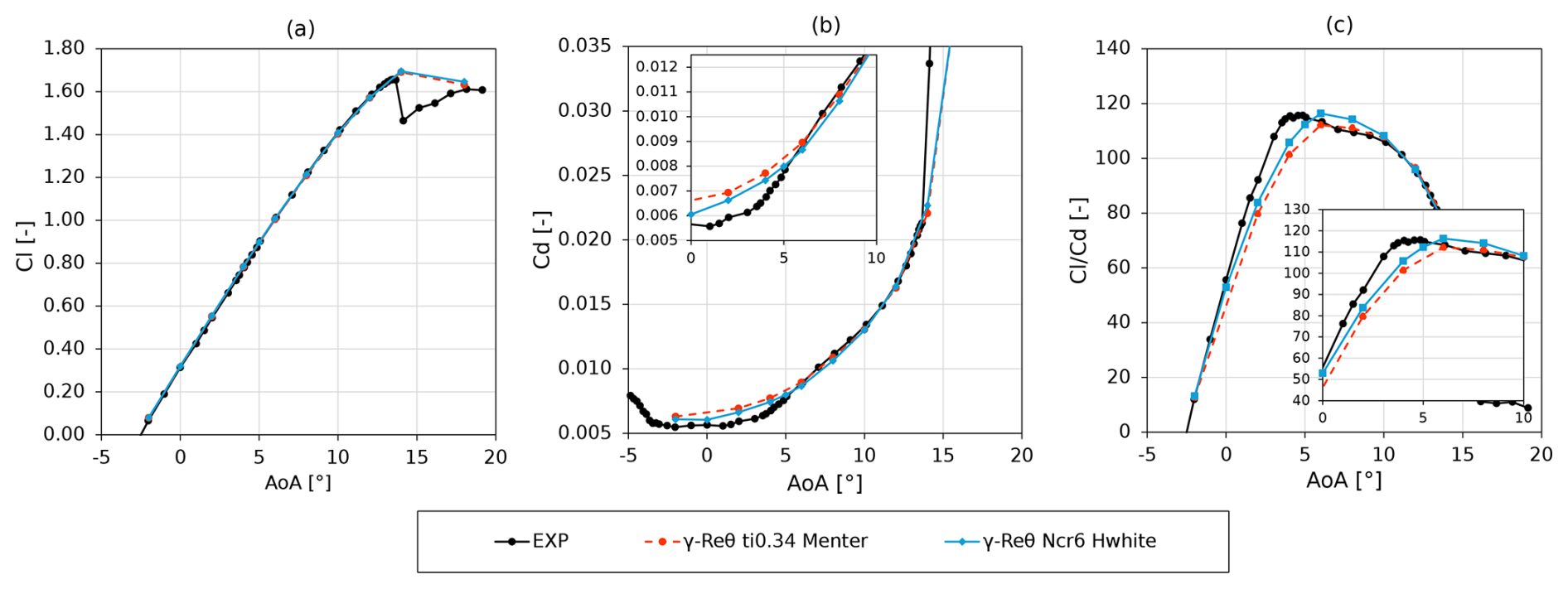 Figure 10Lift coefficient (a), drag coefficient (b), and lift-to-drag ratio (c) as a function of the angle of attack. Experiments from the AVATAR project (Pires et al., 2016) are compared to the results obtained with the numerical set-up described in Sect. 2 and various correlations for the γReθ transition model on the DU00-W-212 airfoil. Reynolds number of 15×106, turbulence intensity of 0.34 %, and reference data from Ozlem et al. (2017).