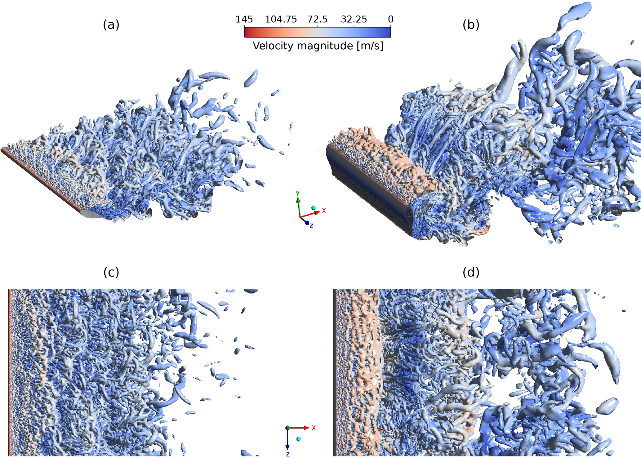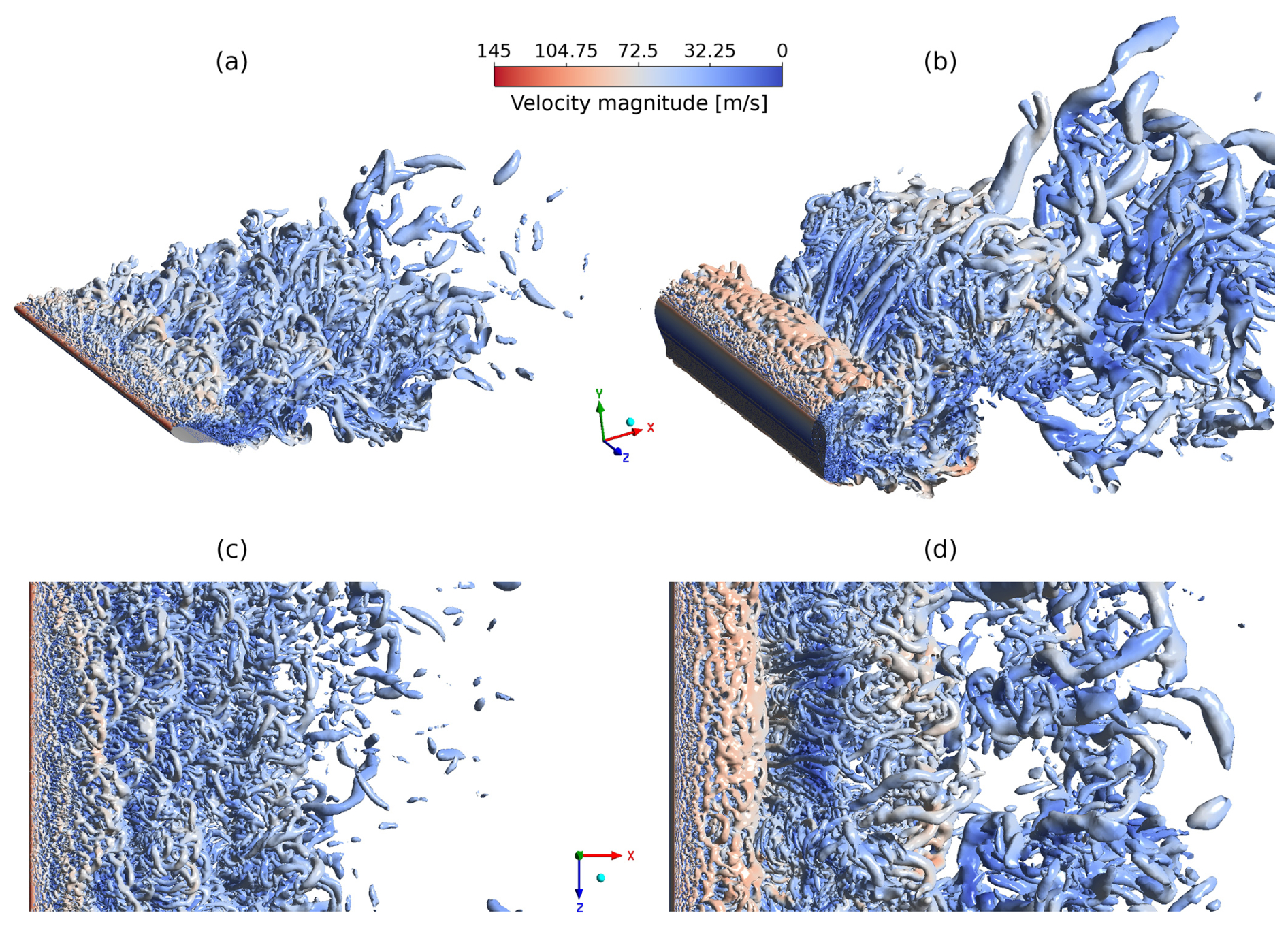 Figure 11Q-criterion isosurfaces for the FFA-W3-241 airfoil at 30° (a, c) and 90° (b, d) angle of attack from scale-resolving SBESs. Reynolds number of 10×106. Side view (a, b) and top view (c, d).