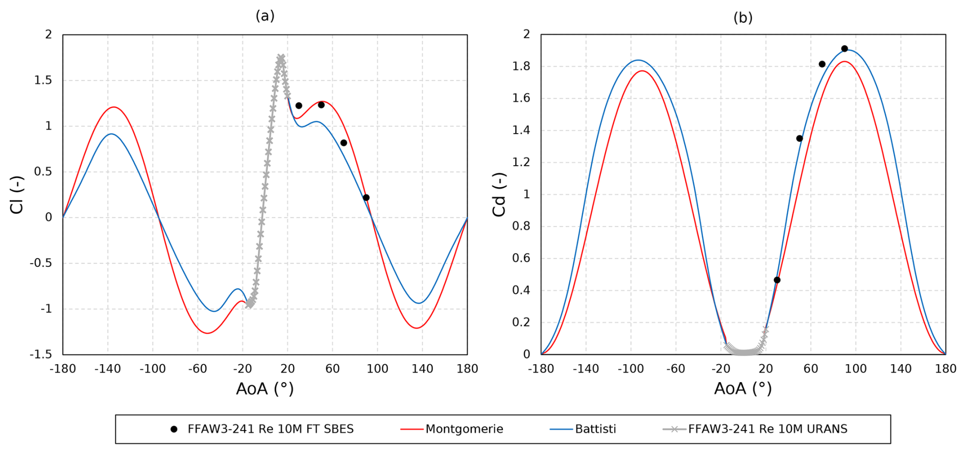 Figure 12Lift (a) and drag (b) coefficients for the FFA-W3-241 airfoil at a Reynolds number of 10×106. Two-dimensional CFD simulations extrapolated with the methods proposed by Montgomerie (2004) and Battisti et al. (2020) compared to scale-resolving SBESs.
