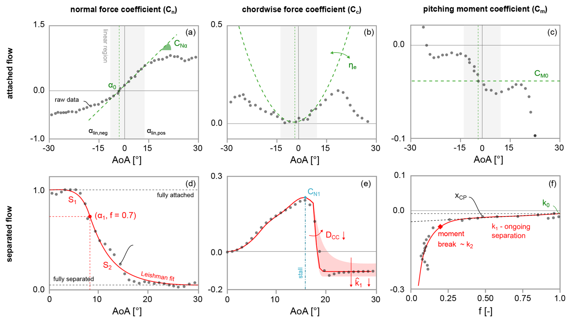Figure 13Visual representation of the computation of the different parameters required by AeroDyn dynamic stall models from static polar data: (a–c) attached-flow coefficients and (d–f) separated-flow coefficients.
