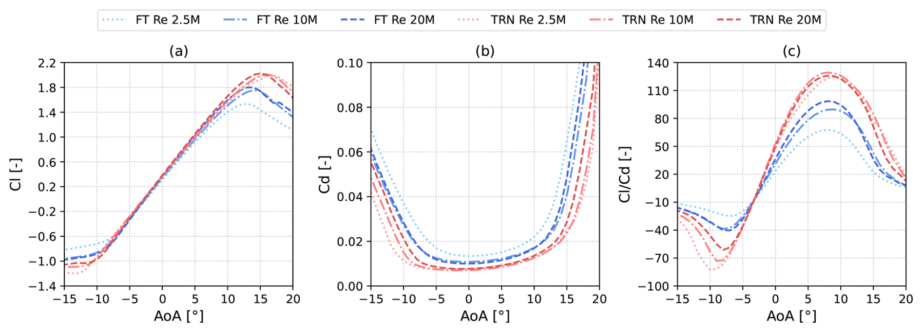 It must be noted that the inflow turbulence wind turbine airfoils experience during operation varies widely due to many factors. Depending on the turbulence level in the incoming wind field, the actual turbulence on the blade section scales based on the relative velocity, which depends on the local tip speed ratio of each section. Especially in the case of outboard blade sections, this can lower the turbulence intensity level significantly. The many factors at play make choosing a single value challenging. However, providing users of the dataset with coefficients computed with low inflow turbulence and a fully turbulent boundary layer allows for interpolation between the two, in order to fine-tune the coefficients to the application and the level of desired conservativeness, if used for blade design applications.