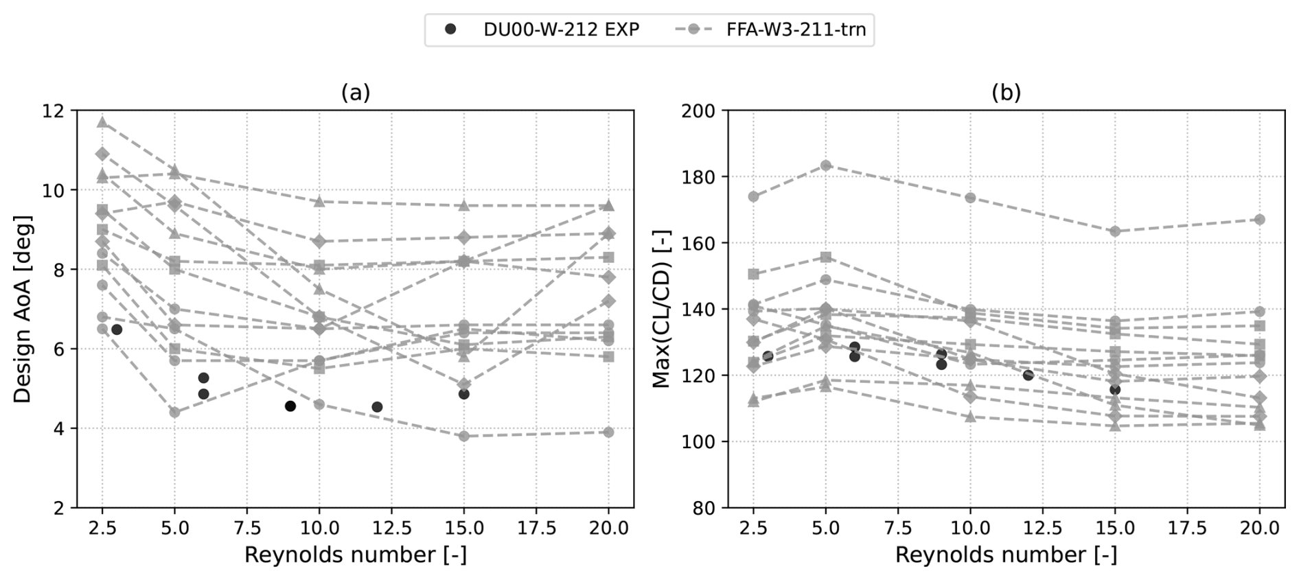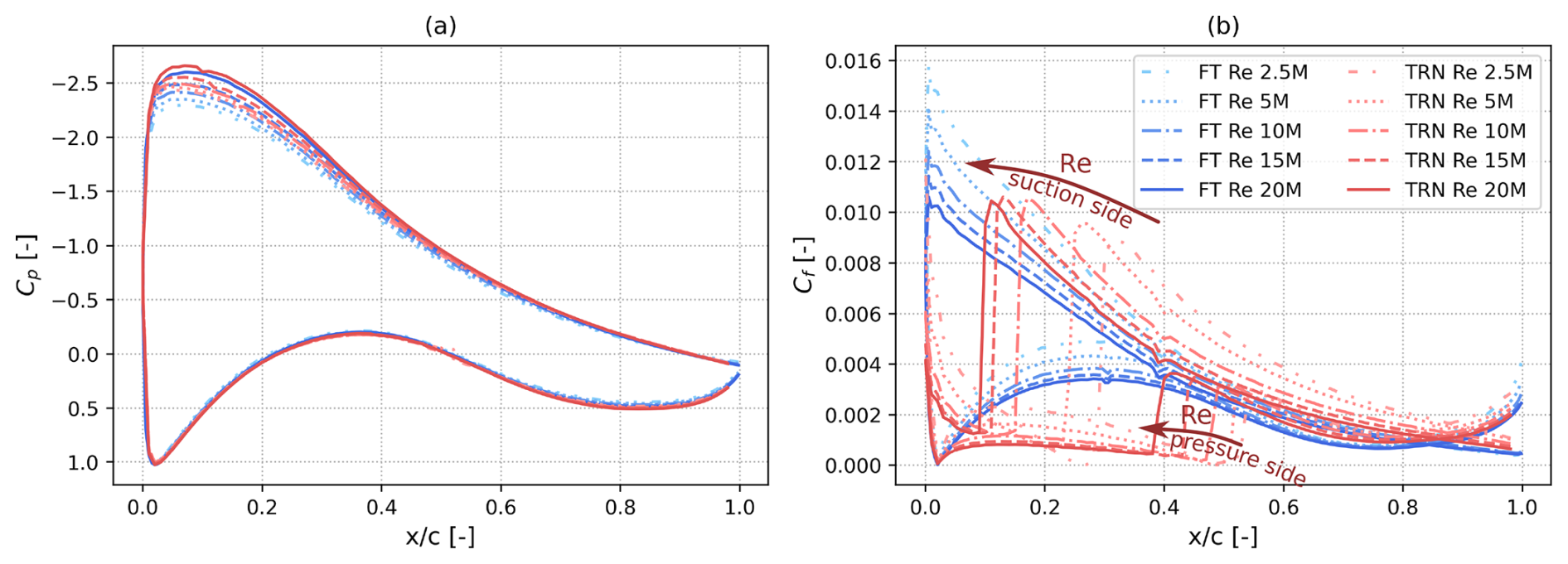 The numerical set-up was verified with respect to the numerical simulations of the DU00-W-212 airfoil performed by Sørensen et al. (2016). The lift-to-drag ratio for the DU00W-212 airfoil at a Reynolds number of 3×106 and a Mach number of 0.075 is shown in Fig. 9a. The pressure and skin friction coefficients at an angle of attack of 4°, obtained through an incompressible fully turbulent simulation of the DU00-W-212 in the same flow conditions, are shown in Fig. 9c and d. The data are overlaid on the numerical simulations from Sørensen et al. (2016), where the flow is considered incompressible in all the simulations. In addition to highlighting very good agreement between the current set-up and the reference data, Fig. 9a also shows a 2.2 % decrease in the lift-to-drag ratio at the angle of attack of peak efficiency of 8°. This measurable reduction in efficiency is present despite the relatively low inflow Mach number of 0.075, motivating the inclusion of compressibility in the dataset.