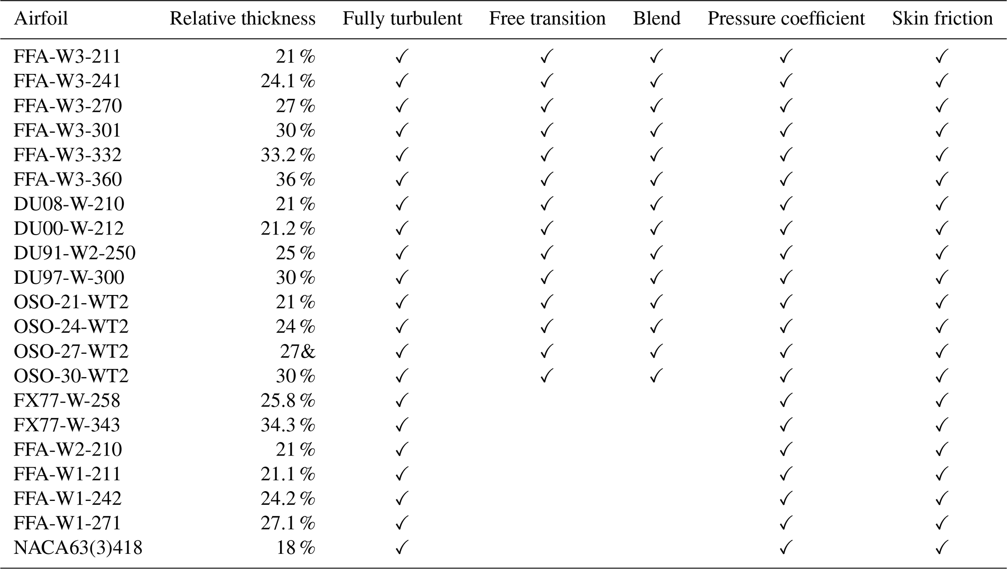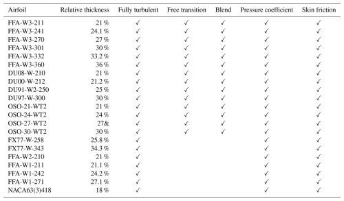 Table 1Airfoils included in the dataset. Free transition: simulations with boundary layer transition (clean blade). Fully turbulent: simulations without boundary layer transition (soiled blade). Blend refers to a 70 % free transition and 30 % fully turbulent interpolation, to be used as a reference for blade design.