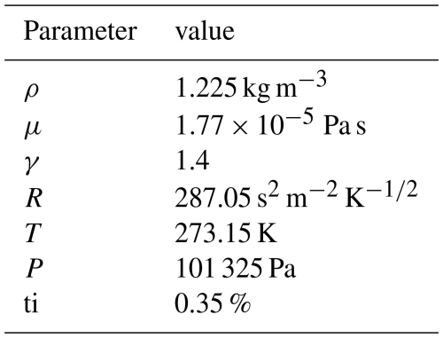 where ρ is the air density, μ is the dynamic viscosity of the fluid, γ is the ratio of heat capacity at constant pressure and at constant volume, R is the gas constant, and T is the temperature of the fluid. Modern wind turbine blades, particularly those of offshore machines, are increasingly large. As such, chord-based Reynolds numbers can exceed 15×106 (Karcher et al., 2025). The mean values assumed in this study and their measurement units are summarized in Table 2, which also reports the reference conditions in terms of pressure P and turbulence intensity ti considered for the simulations. A turbulence intensity of 0.35 % is considered to match the conditions where the computational model is tuned and validated, as explained in detail in Sect. 3.1. In addition, this value is in line with the state-of-the-art. For instance, it is not uncommon to see aerodynamic coefficients used in blade design exercise being computed with Ncrit values in the range of 7 to 9 (Zahle et al., 2024), which correspond to low levels of turbulence intensity, as shown in Eq. (6) discussed later on in this study.