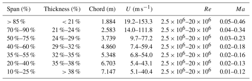 The chord length, Reynolds number, inflow velocity, and Mach number ranges assumed for each airfoil relative thickness are shown in Table 3. Five Reynolds numbers are simulated for each airfoil: 2.5×106, 5×106, 10×106, 15×106, and 20×106. As a consequence of the smaller chord of the tip airfoils and since the same range of Reynolds number was simulated for all relative thicknesses, a maximum velocity of 153.3 m s−1 is considered for airfoils with relative thickness of 21 % and below. This velocity should rather be regarded as a conservative upper bound and is unlikely to be reached during steady-state wind turbine operation. However, its inclusion ensures that the dataset remains valid under transient scenarios, such as rotor overspeed events, extreme gusts, or rapid changes in operating conditions, which can temporarily lead to significantly increased local inflow velocities. The portions of blade span upon which the airfoils are assumed to insist are shown in Fig. 3.