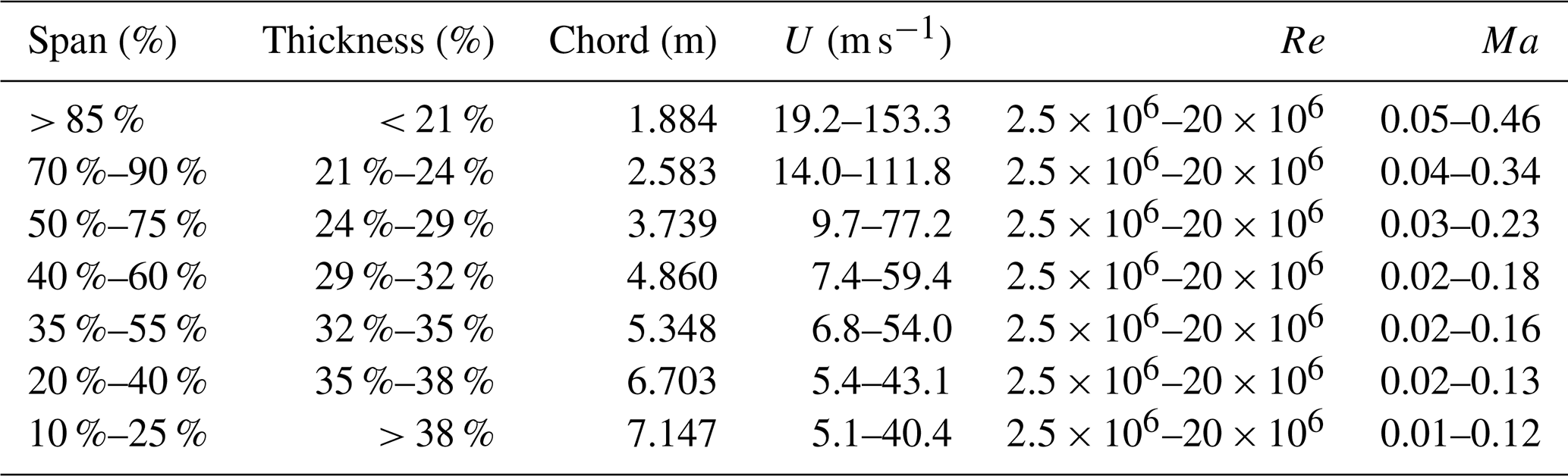 The second key improvement of this dataset is the fact that multiple Reynolds numbers are considered. In fact, the Reynolds number can vary greatly during operation in actual wind turbines, as the relative inflow velocity changes due to the varying wind speed and rotor speed. In order to select the most appropriate combination of Reynolds and Mach numbers for the various airfoils, the IEA 22 MW blade design was assumed as a reference, as it is the most recent and representative of the size and characteristics of upcoming offshore rotors. Individual airfoils are assigned to a representative span of the blade based on their thickness, as thicker airfoils are generally used in the inner part of the blade, while thinner ones are preferred in the outboard part to improve aerodynamic efficiency. Once the average chord of the blade section is computed, the inflow velocity for a given Reynolds number (Eq. 3) can be computed by inverting Eq. (1):