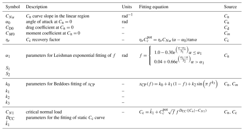 For the attached-flow regime, constants α0, CNα, CD0, CM0, and η are directly obtained from the Cn, Cc, and Cm curves. The zero-lift angle of attack α0 is located at the intersection of the Cn(α) curve with the α axis, while CM0 and CD0 are the moment and drag values at α=α0 (see Fig. 13a–c). The curve slope CNα is evaluated via linear regression of the data in the linear region, delimited in Fig. 13a by the interval [αlin,negαlin,pos]. This accounts for possible noise in the static data. In this work, an innovative automated method to identify this region is adopted: (i) progressively narrower intervals, centered on α0, are considered; (ii) for each interval, data are fitted via linear regression, using the corresponding R2 as a linearity index; and (iii) the linear region is identified as the region where R2> 0.99 at both bounds. Finally, the recovery factor ηe is selected by minimizing the discrepancy between ηeCcpot (see Table 5) and the pressure component of chordwise force Ccstat=Clsinα-(Cd-CD,0)cosα in the linear region (see Fig. 13b).