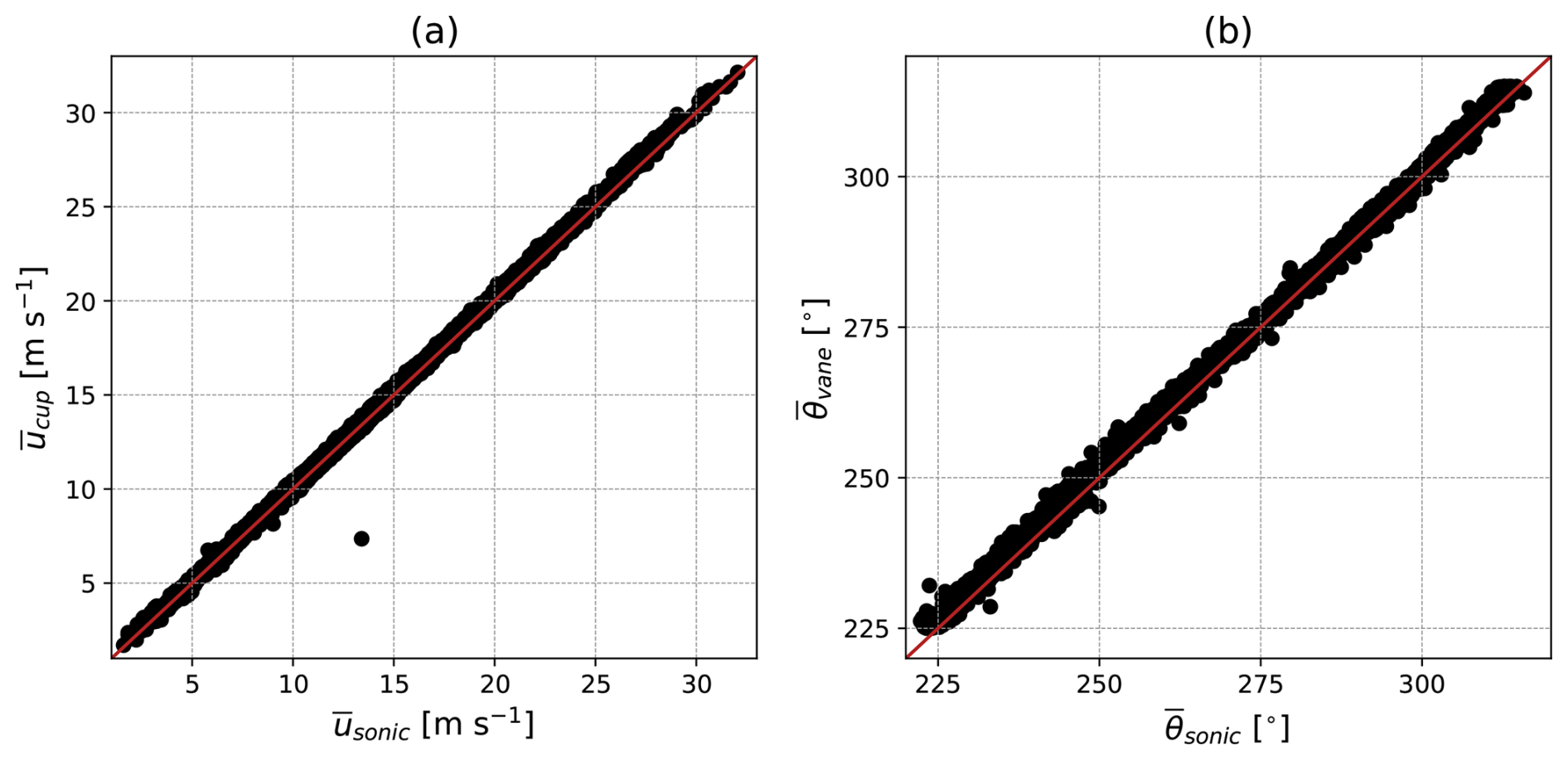 Figure 1(a) The 10 min mean wind speed measured by the sonic anemometer at a height of 155 m compared to measurements made by the cup anemometer at a height of 163 m, when the mean wind direction was between 225° and 315°. (b) The 10 min mean wind direction (in meteorological coordinates) measured by the sonic anemometer compared to measurements made by the wind vane at a height of 159 m. Note that the red line has a slope equal to 1.