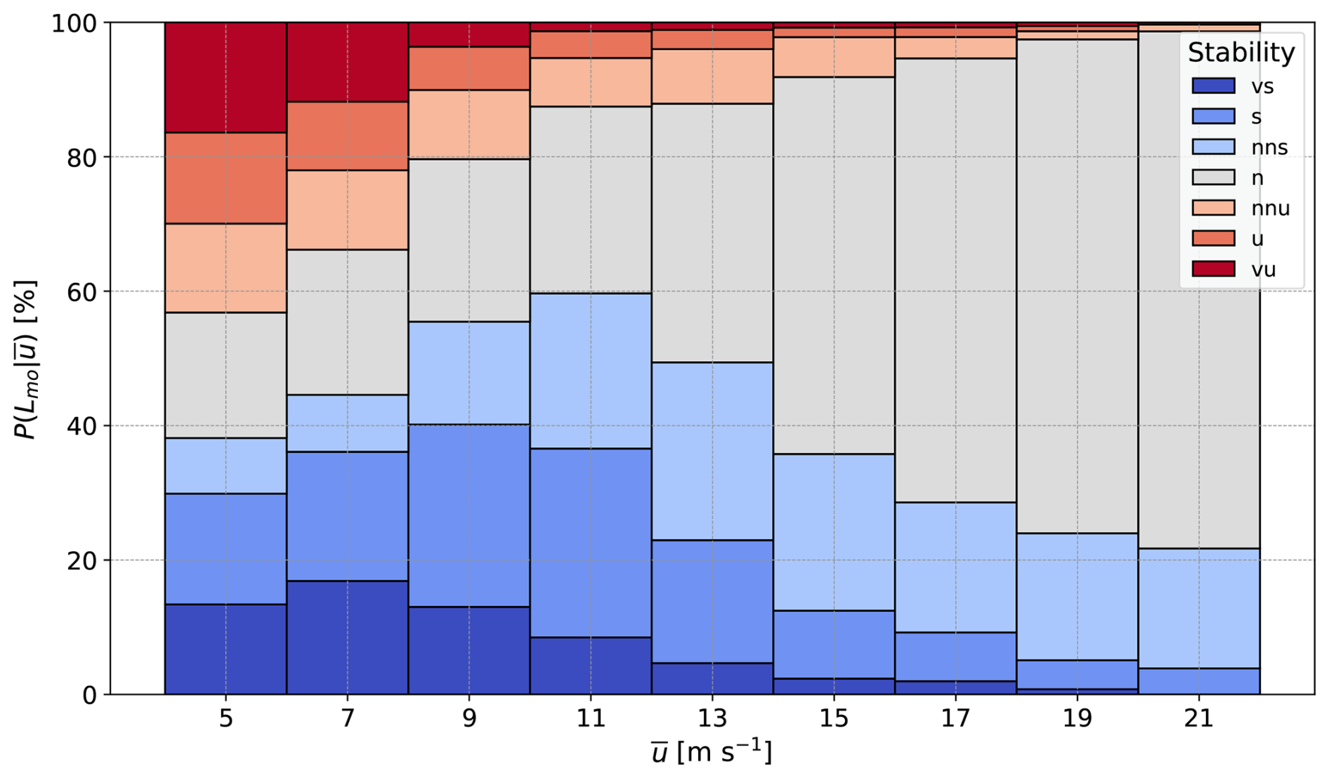 Figure 2The distribution of atmospheric stability quantified by the Monin–Obukhov length (Lmo) conditioned on the 10 min mean wind speed ().