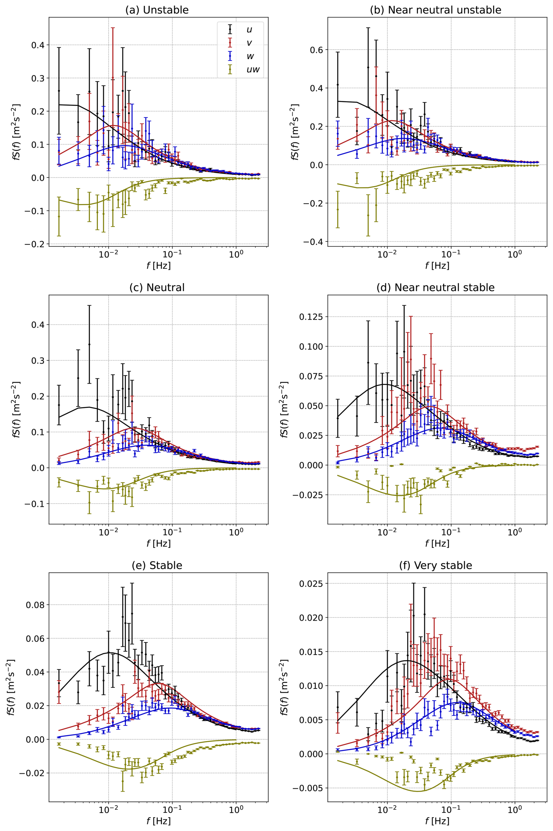 Figure 3The estimated pre-multiplied auto-spectra of the u, v and w components and the real part of the uw cross-spectrum under varying stability conditions, along with a mean wind speed of 9 m s−1.