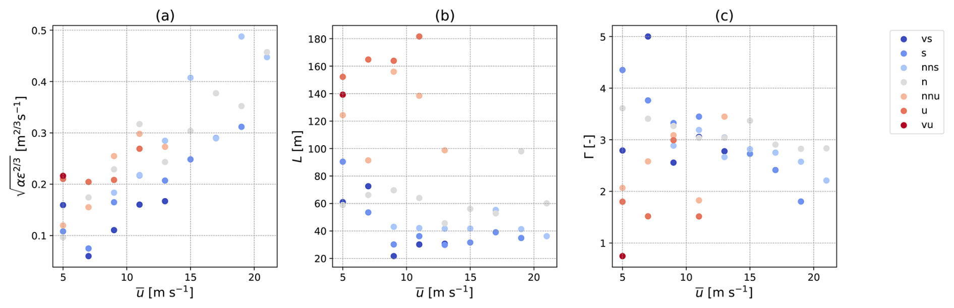 The model parameters obtained in each stability and wind speed bin are shown in Fig. 4. The parameter is proportional to the square of the mean wind speed (Syed and Mann, 2024) and hence is observed to vary linearly with . Furthermore, is also related to the variance in the wind speed (Kelly, 2018). Thus, Fig. 4a shows that higher wind speeds are associated with more turbulence. Length scales as large as 180 m are observed in certain unstable conditions, while stable conditions usually show length scales lower than 50 m. The anisotropy parameter Γ appears to be lower for unstable conditions as compared to stable conditions at low wind speeds. Γ is related to the ratio of the variances in the three wind components, and Γ=0 when . Thus, convective conditions show lower values of Γ, as the fluctuations in v and w tend be to stronger than under stable conditions. The variation in Γ decreases with wind speed, probably due to the decrease in the data availability of non-neutral stabilities at higher wind speeds. Note that Γ might also depend on surface roughness and boundary layer depth, which are outside the scope of this study but can be investigated in the future.