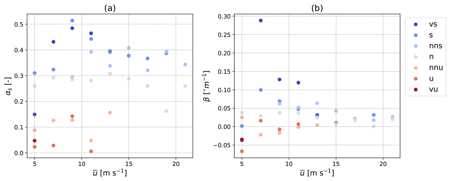 β is obtained by fitting the measured profile of to Eq. (10). The values of αs and β for all stability and wind speed bins are shown in Fig. 5. A larger variation with height in the wind speed and direction is observed during stable conditions as compared to unstable conditions, as more turbulent mixing occurs in the latter, which leads to more uniformity in the mean wind speed and direction.
