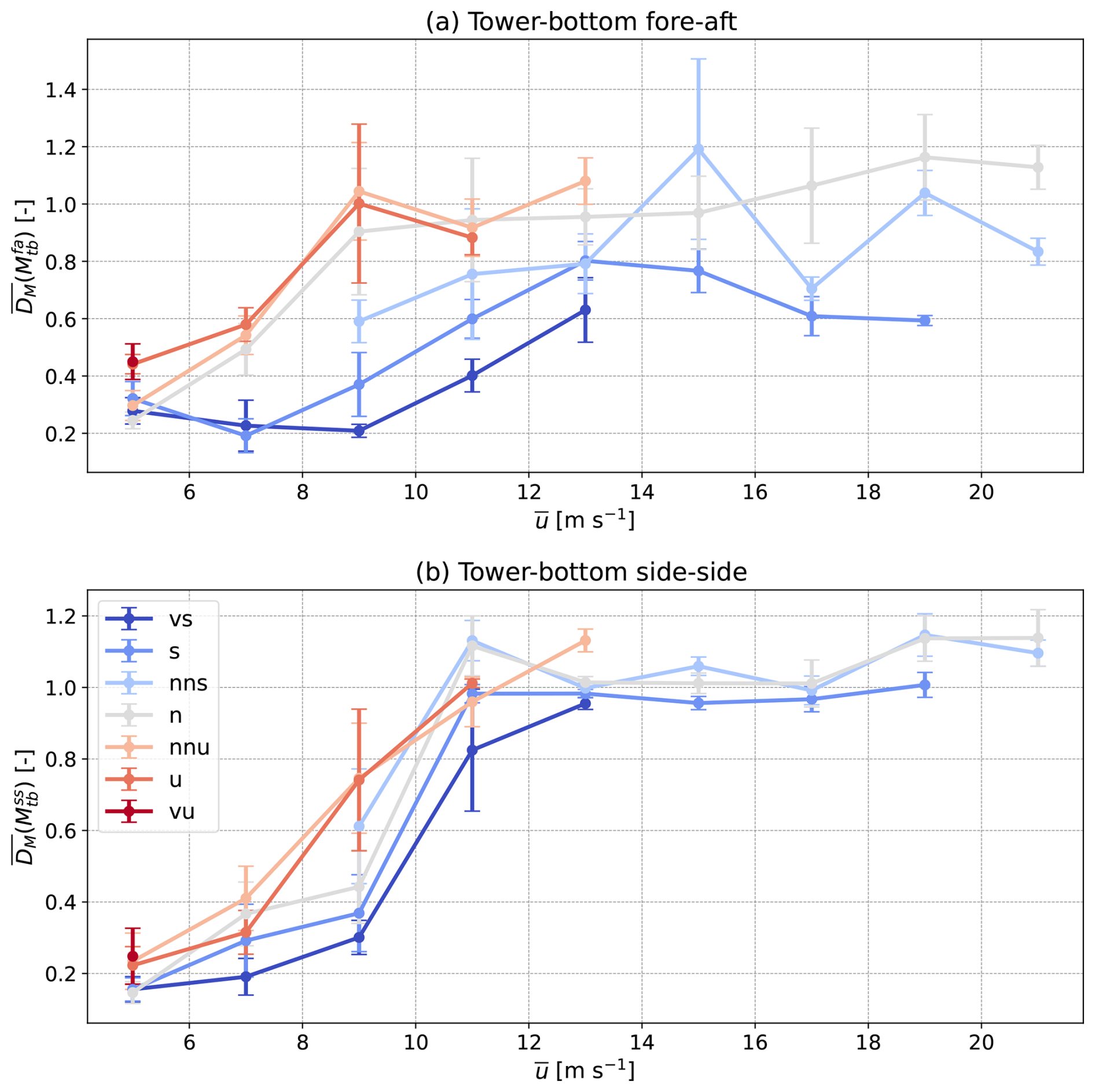 The mean damage equivalent moments are computed from the measurements of bending moments at the tower bottom and blade root, and are shown in Figs. 6 and 8 as functions of wind speed and atmospheric stability. Note that the fore-aft direction is parallel to the mean wind direction and side-side is perpendicular to it, when the yaw-misalignment is zero. Moreover, Fig. 8 shows the damage equivalent loads on one of the blades, although similar results were obtained for all three. Lastly, the error bar indicates the standard deviation of the damage equivalent moment, which is also scaled according to Eq. (16).