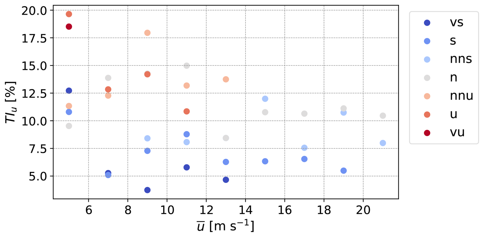 Figure 7The measured turbulence intensity TIu of the along-wind component for each wind speed and stability bin at a height of 155 m. Note that TIu is computed as the average over all 10 min periods in a given bin.