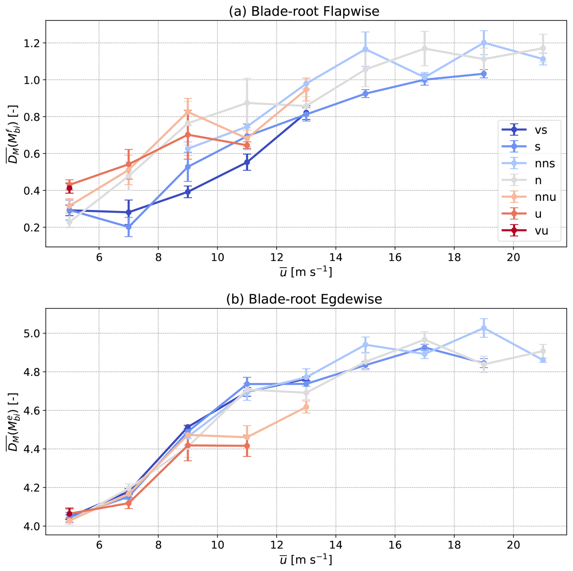 Figure 8The mean damage equivalent moments at the root of blade 1 in the (a) flapwise and (b) edgewise directions as functions of wind speed at 155 m and stability.