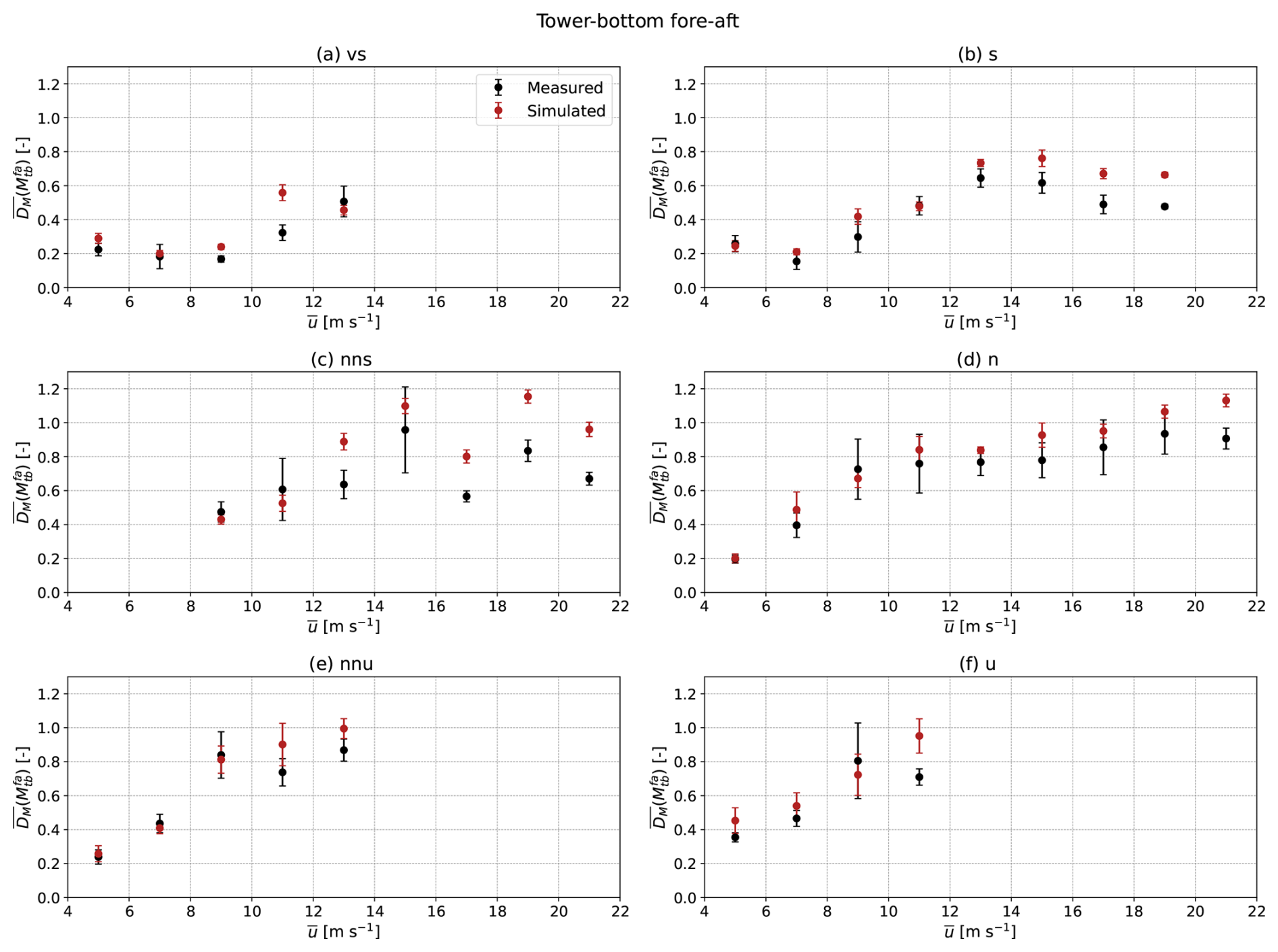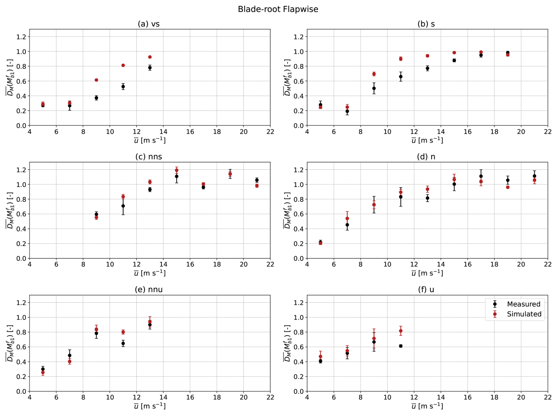 The damage equivalent loads on the blade in the flapwise direction are impacted to a lower degree by atmospheric stability. At wind speeds below rated (the rated wind speed is approximately 11 m s−1), unstable and neutral conditions cause approximately 20 % more fatigue damage as compared to stable conditions. However, at wind speeds above rated, the damage equivalent loads under neutral and stable conditions differ by −2 %. These observations are caused by the opposing effects of turbulence and shear, both of which affect the fatigue loads on a wind turbine blade. While unstable conditions are more turbulent, the mean wind speed does not vary appreciably with height. Stable conditions show converse behaviour such that the two drivers of fatigue loads (turbulence and shear) tend to nullify each other in Fig. 8. Moreover, as pitch control is activated at wind speeds above rated, the blade pitches out of the mean wind. Hence, the flapwise loads become less sensitive to turbulence and shear becomes relatively dominant. This causes stable conditions to be slightly more detrimental at high wind speeds. In the case of the edgewise loads on the blade, as they are mainly driven by gravity, no significant dependence on stability or turbulence is observed. Thus, we exclude them from the one-to-one comparisons presented in the next section. The side-side loads on the tower bottom are also excluded as they are not only dependent on the inflow but also on a range of different factors such as mass and pitch imbalances on the blades. As it is difficult to accurately quantify these imbalances, they cannot be replicated in a simulation. Hence, attributing any disagreement between measured and simulated loads to differences in the inflow cannot be achieved with a sufficient degree of confidence. On the other hand, the tower fore-aft and blade flapwise loads are significantly more sensitive to the inflow. Thus, our one-to-one comparison is limited to these two load channels.