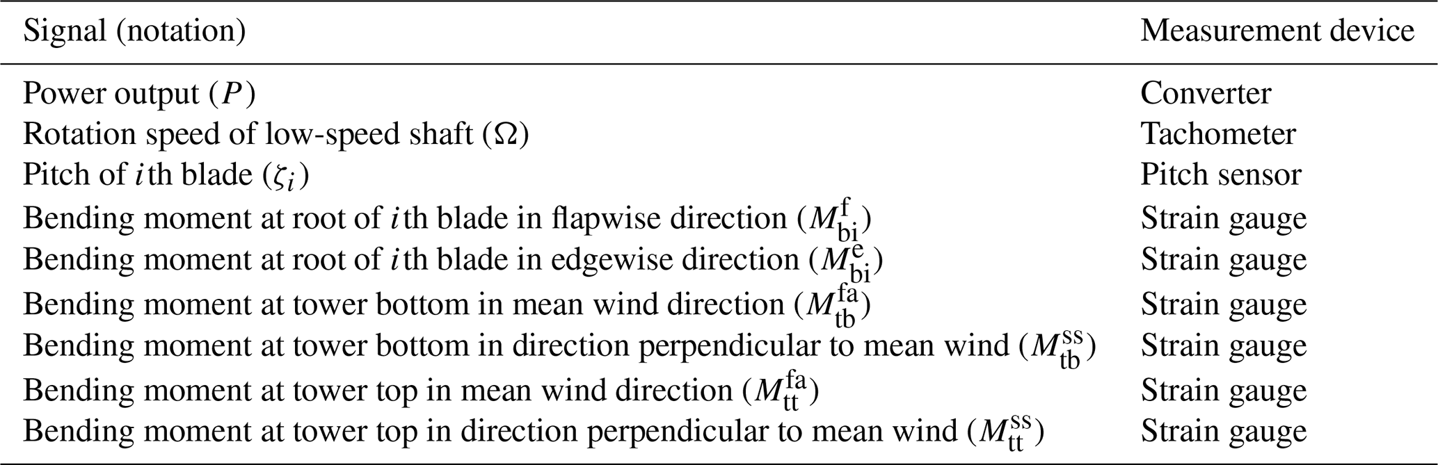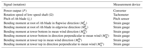 The campaign lasted for 2 years, from 2023 to 2025, and took place at the Test Center Østerild. It is located in north Jutland, Denmark, about 50 km from the coast. We refer the reader to Peña (2019) for a detailed description of the site. The prototype turbine was equipped with many sensors that measured bending moments on various components, the power output of the turbine, pitch angle of all the blades and rotation speed, among other operational data. An overview of the data signals used in this study is shown in Table 1. An IEC-complaint meteorological mast was also present, about 660 m to the west of the prototype. Since the dominant wind direction was westerly, the mast was often present upstream of the turbine. It was equipped with a sonic anemometer at 155 m; cup anemometers at 45 m, 104 and 163 m; and wind vanes at 45 and 159 m above ground level.