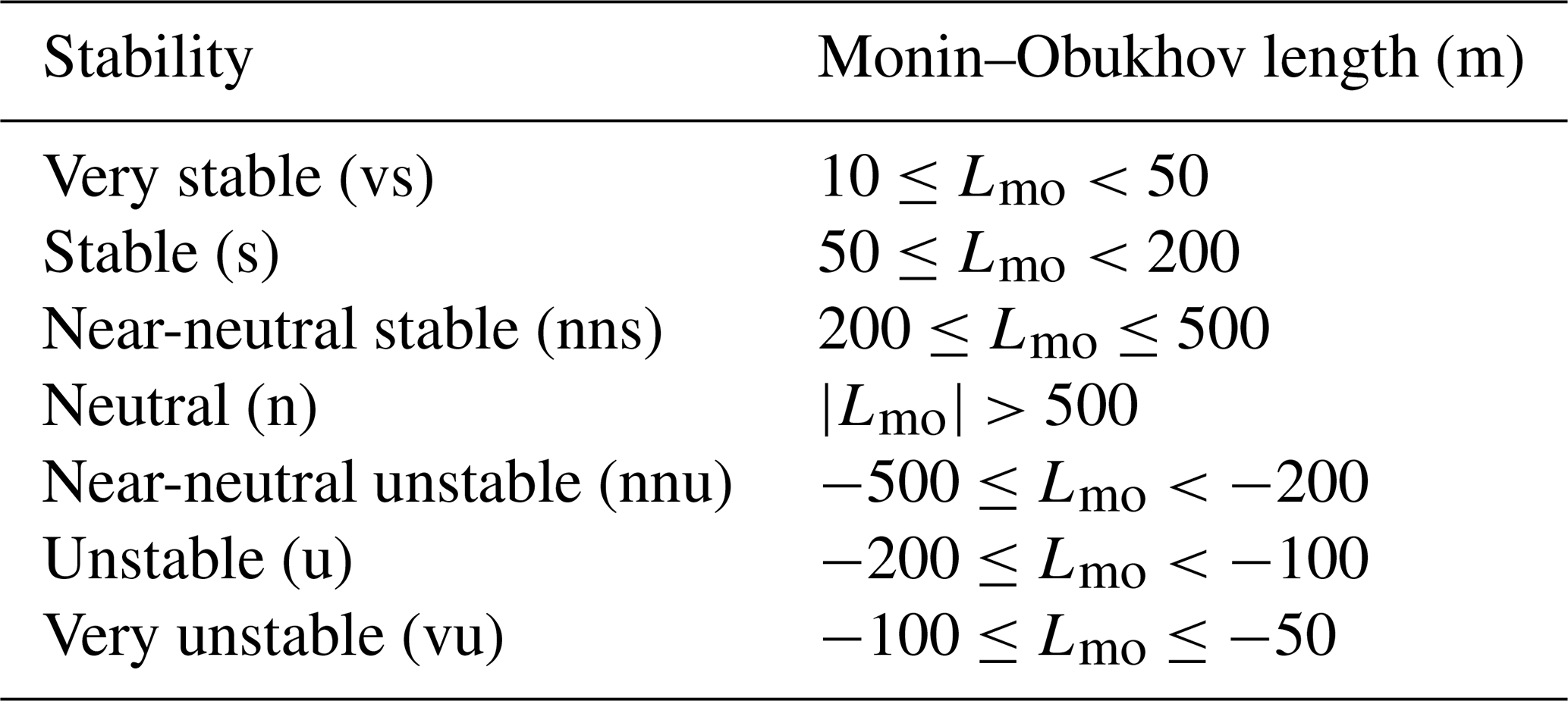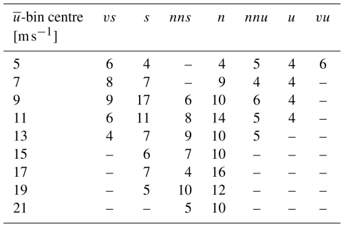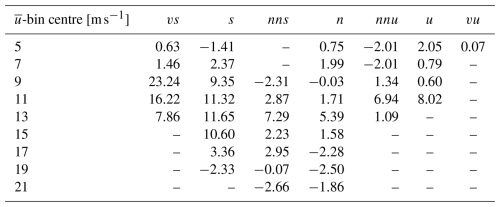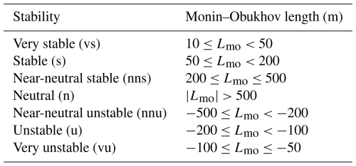 The 10 min data were subsequently binned according to the mean wind speed measured by the sonic anemometer at 155 m and the Monin–Obukhov length based on the stability classifications suggested by Gryning et al. (2007) and shown in Table 3. The size of the mean wind speed bins was 2 m s−1, with the bin centres being odd numbers from 5–21. Table 3 is only applicable within the surface layer where the friction velocity and temperature flux do not change with height. While this assumption may not be strictly valid for the measurement height of 155 m, the reader is cautioned against using Table 3 outside the surface layer.