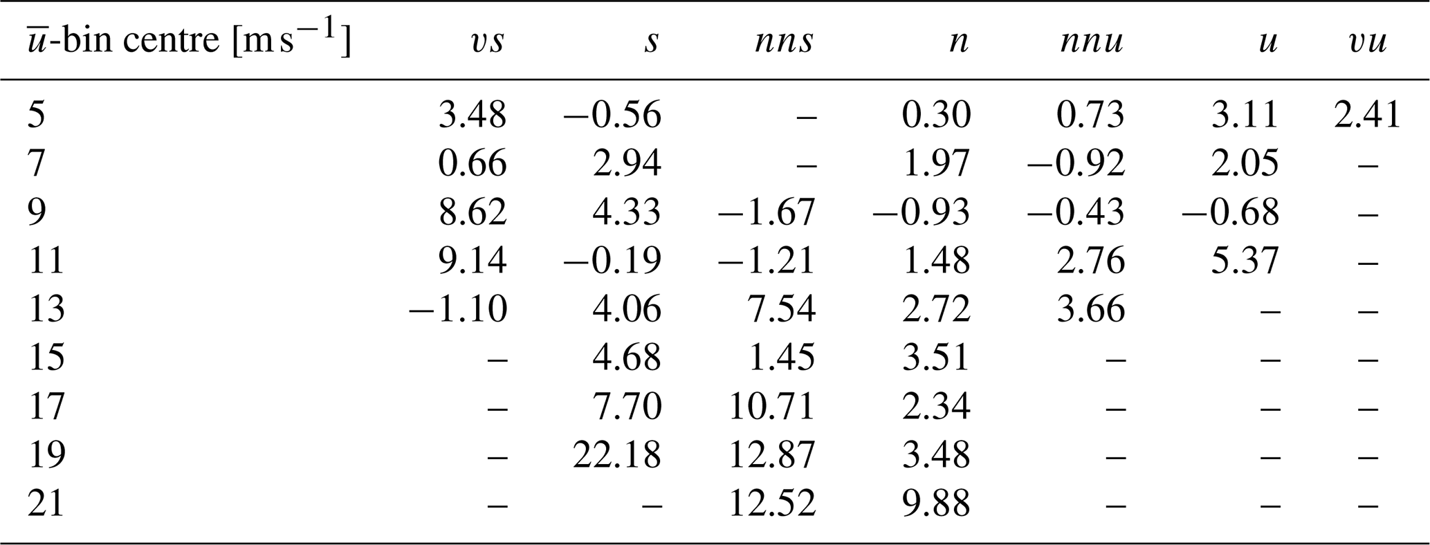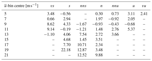 In the subsequent processing step, we aimed to find the longest period of contiguous measurements within each bin. Table 4 shows the capture matrix indicating the number of contiguous 10 min periods (Nbin) found for each bin. The turbulence measurements (namely the auto-spectra) were averaged over Nbin periods and fitted to the Mann model. Thus, we used Bartlett's method (Bartlett, 1948) to compute the auto-spectra. If Nbin<4, the uncertainties in the measurements were deemed to be too high and a fit with the Mann model could not be obtained. As a consequence, a one-to-one comparison could not be carried out in the corresponding bins. In other words, each bin required at least 40 min of continuous data. This condition was satisfied in 39 bins.