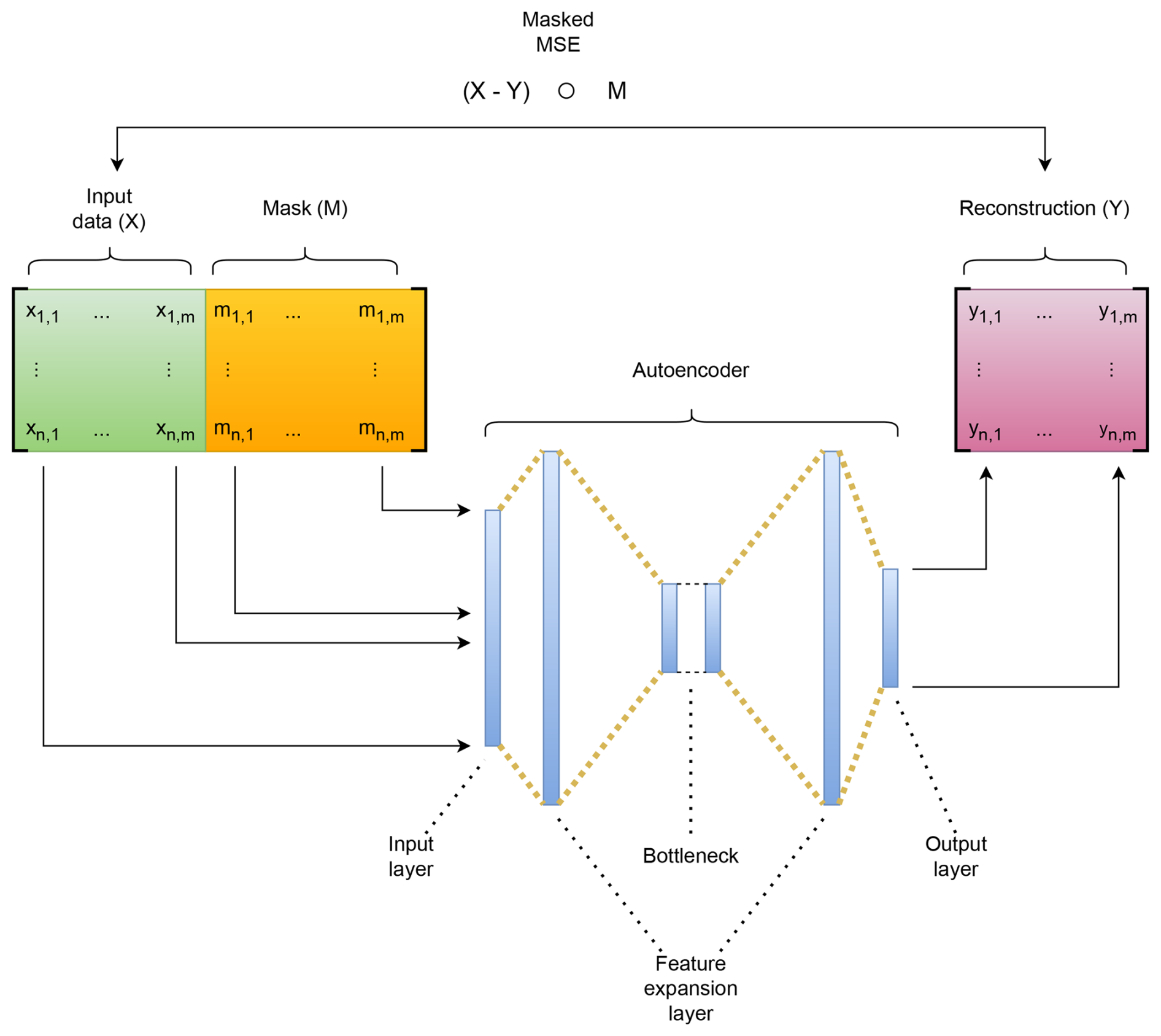 Symmetric architecture. The encoder and decoder are mirror images, except that the encoder input layer has dimensionality 2m due to concatenation of X and M, while the decoder outputs m reconstructed features.