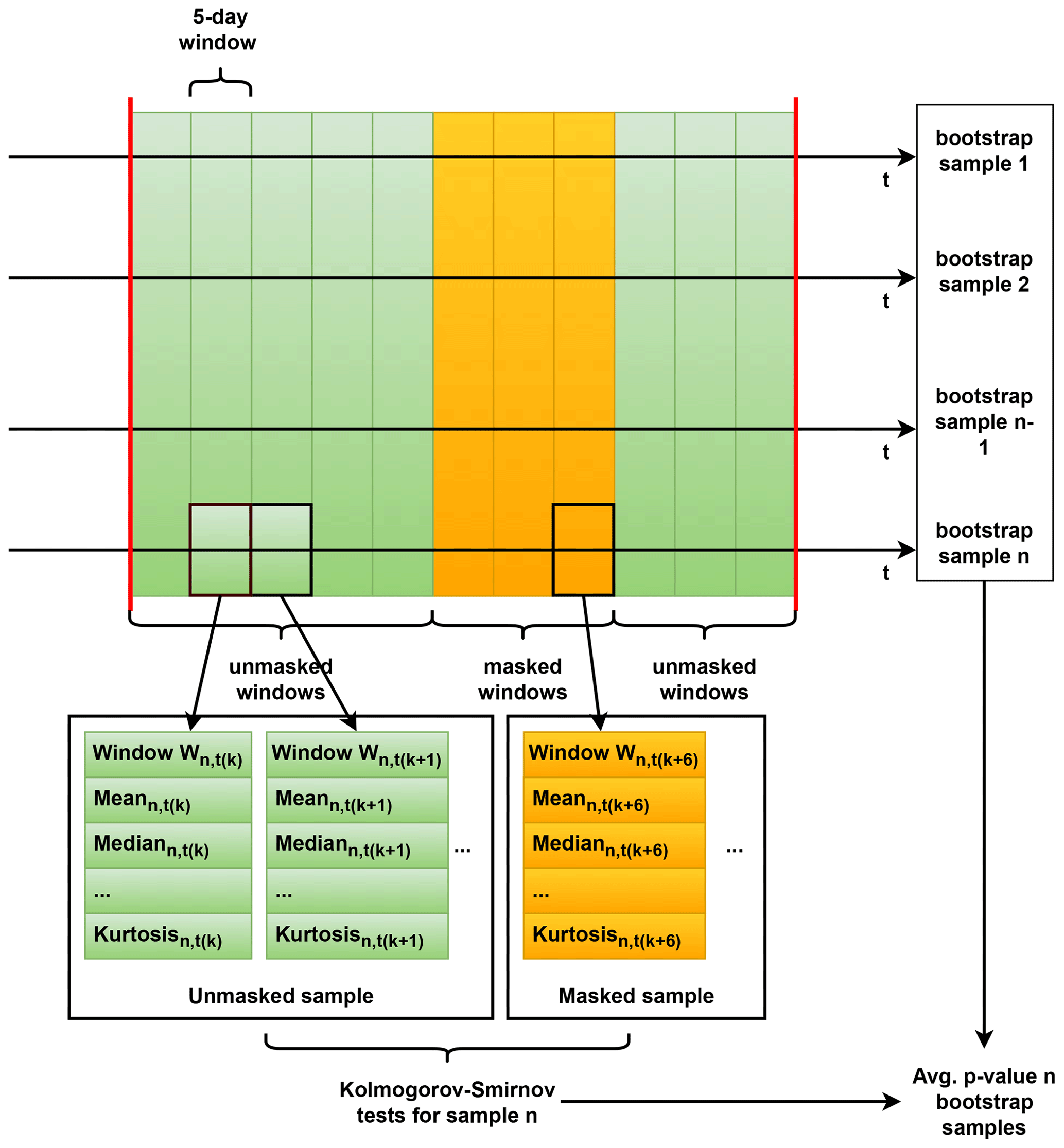 The IFDW data are segmented into blocks of 5 d, and the metrics listed above are computed for each block. Blocks are then labeled as masked or unmasked (masked if they are part of the masked window, unmasked if they are not). To determine whether the distributions differ between the two groups, the two-sided Kolmogorov–Smirnov test (KS test) (95 % significance level) is applied. For each signal and each bootstrapped model, one p value is obtained, yielding 200 p values per signal (one for each resampled dataset). Their mean is then computed. The MAE is considered to perform adequately if, for all signals except the one affected by the sensor error, the average p value exceeds 0.025 (2.5 %).