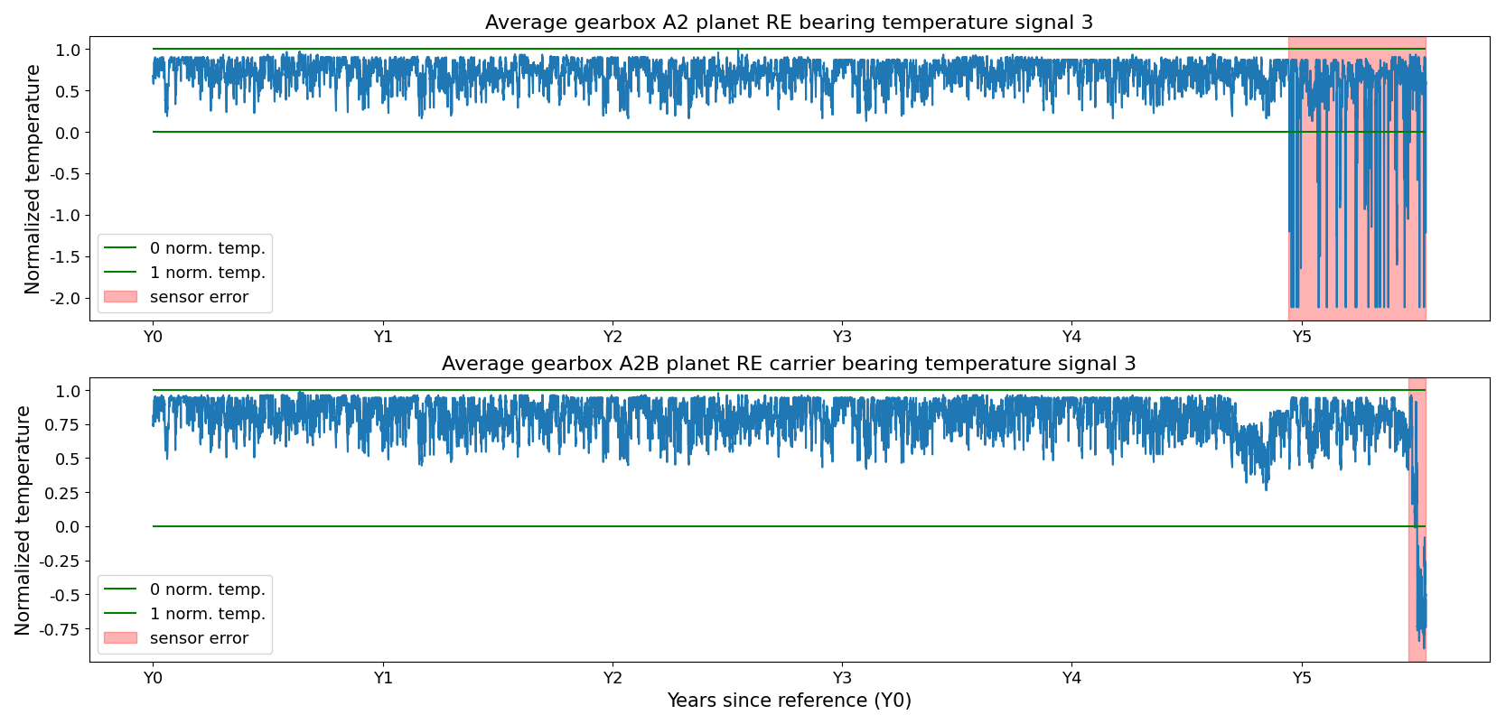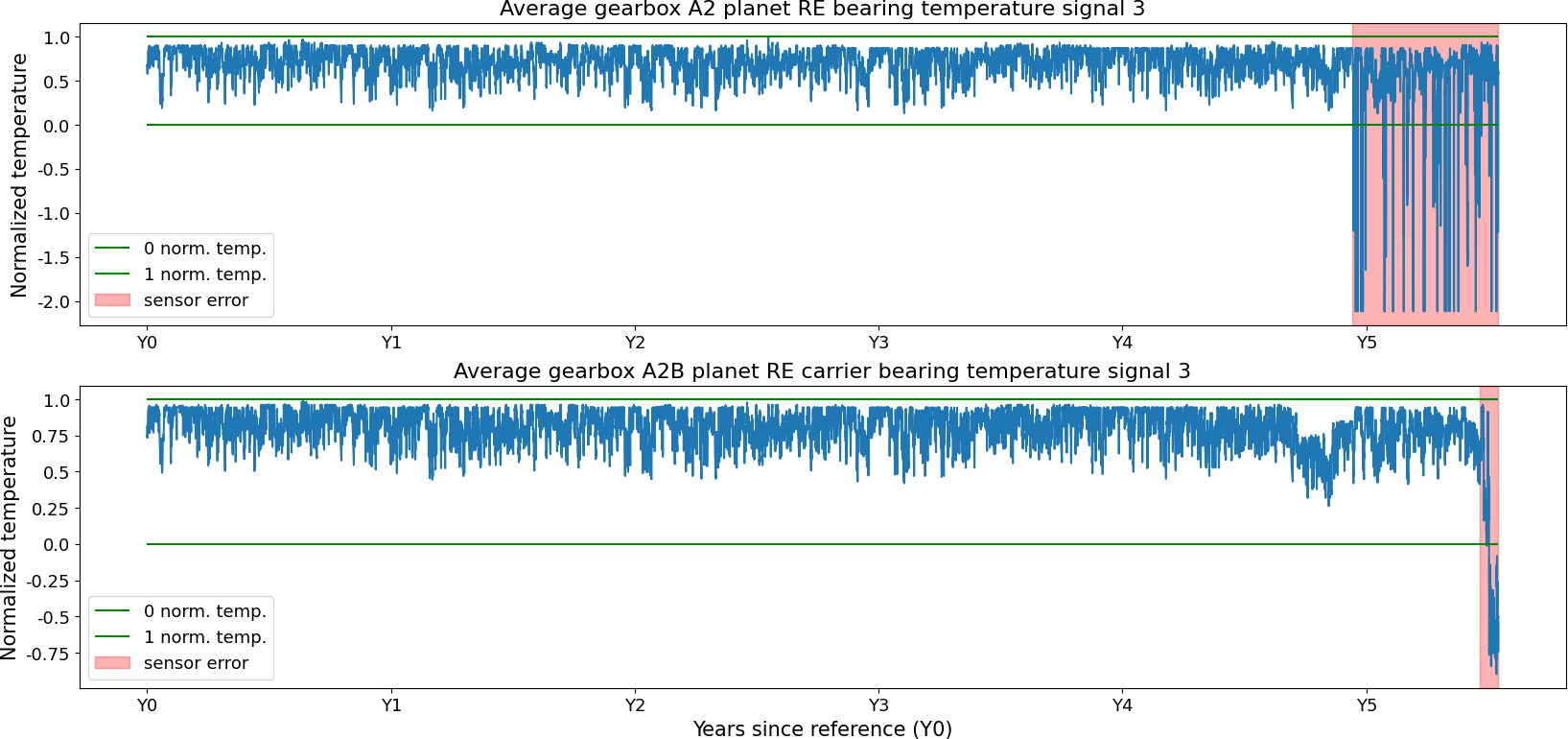 Figure 3Sensor failures in two signals of the turbine in WF1. The sensor failure is a combination of types, i.e., bias and scaling.