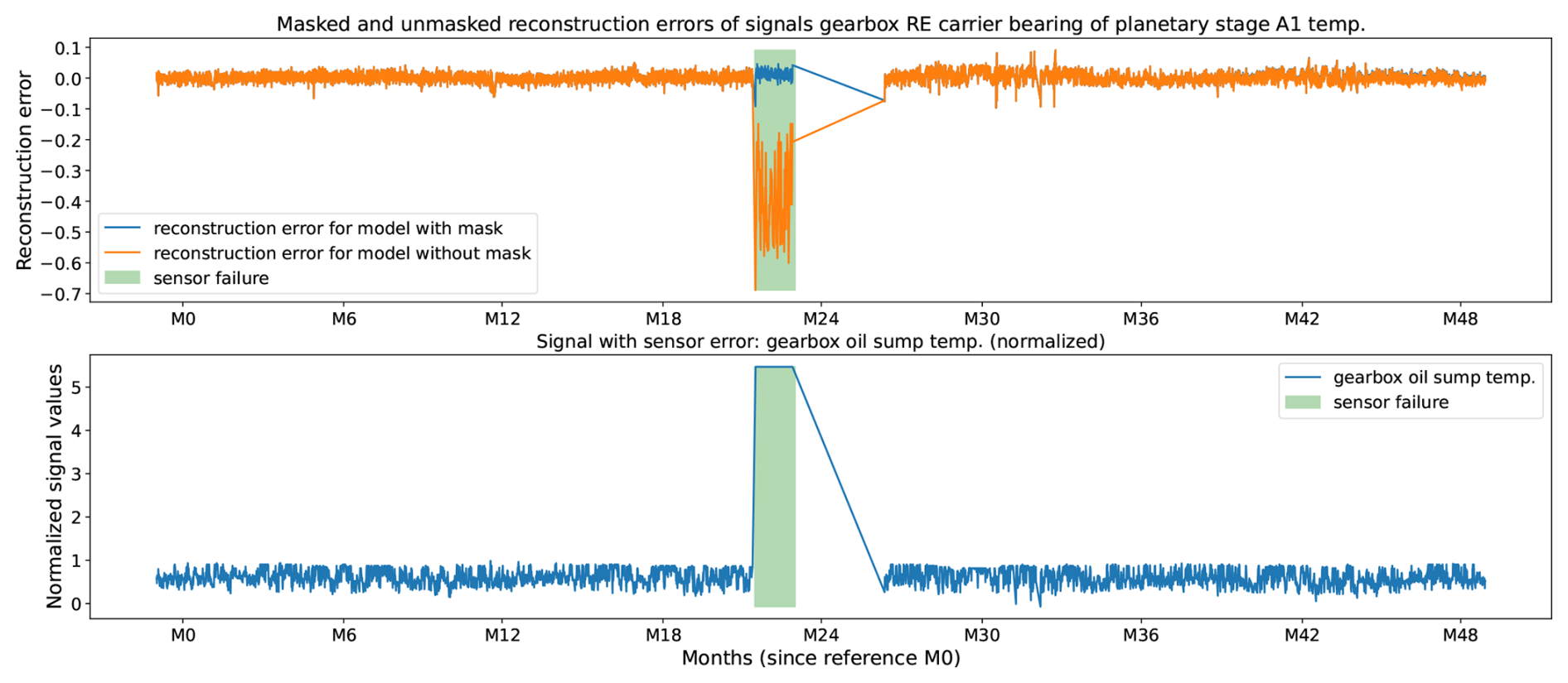 Figures 6 and 7 provide qualitative insight into the behavior of the algorithm. The bottom plot in each figure shows the normalized signal that is generated by the faulty sensor. The window during which the sensor has failed is highlighted with a green box. The top plot shows the reconstruction errors for a signal different from the one suffering from the sensor failure. The model generates the orange reconstruction error when the data generated by the faulty signal are not masked and the blue reconstruction error when they are masked.