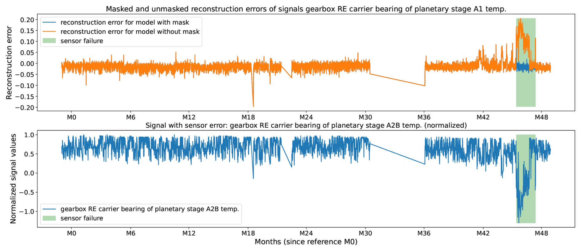 In Fig. 6, the failure occurs in the gearbox oil sump temperature sensor (bottom panel). When the failure is not masked, the corrupted measurement propagates through the learned correlations and induces distortions in the reconstruction errors of other signals, for example, the temperature measured at the gearbox rotor end (RE) carrier bearing of planetary stage A1 (orange line in top plot). These distortions render the anomaly detections for these signals unreliable. Specifically, the failed sensor exhibits a sudden upward bias, which in turn produces an inverted (downward) bias in the reconstructed estimates of correlated signals (orange line in top plot). Because the AE models the normal relationships among these variables, an anomalously high value in one variable prompts overestimation of the corresponding “normal” values of others, leading to negatively biased reconstruction errors. When the gearbox oil sump temperature signal is masked when suffering from the sensor error (green box) the reconstruction error is not influenced by the reconstruction bias, and the error remains in line with the errors outside the green box (blue line in top plot). This indicates that the MAE and the masking of the faulty signal work well.
