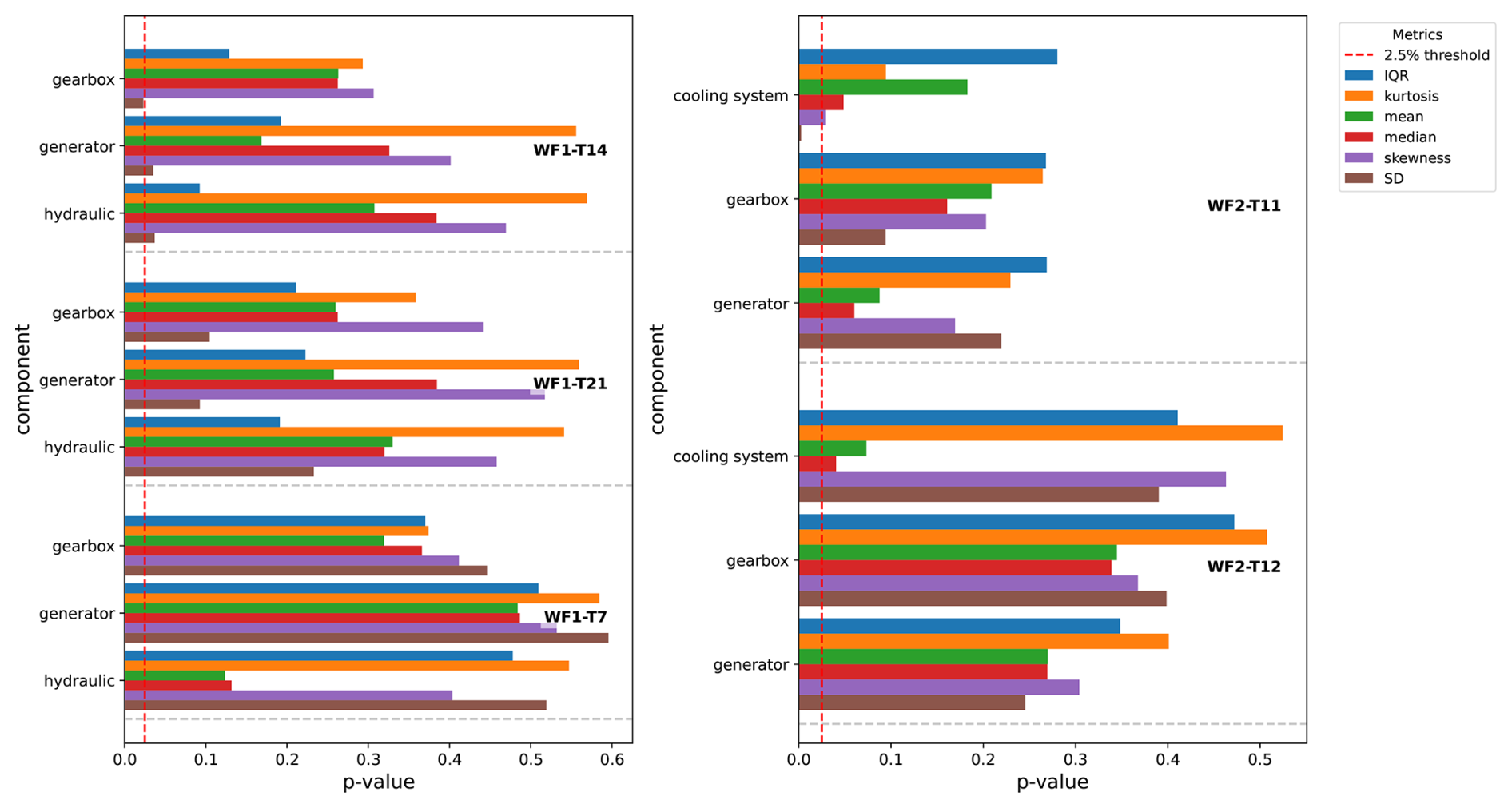 Figure 8Figure shows for several turbine components, i.e., generator, gearbox, and hydraulics for wind farm 1 (left subfigure) and cooling system, gearbox, and generator for wind farm 2 (right subfigure), the mean of the p values of the KS tests for several distribution-describing metrics, i.e., interquartile range (IQR), kurtosis, mean, median, skewness, and standard deviation (SD). The mean is determined as the average of the p values of the KS tests of the temperature signals that are related to the component (see Tables A1 and A2). The red dotted vertical line indicates the 2.5 % threshold (threshold that separates significant from insignificant evidence against the null hypothesis). The longer the bars, the more similar the metrics are for the reconstruction errors of the signals generated in windows with and without sensor errors. The x axis shows the p values for the different metrics and components. The y axis indicates the component. The colors indicate the metric.