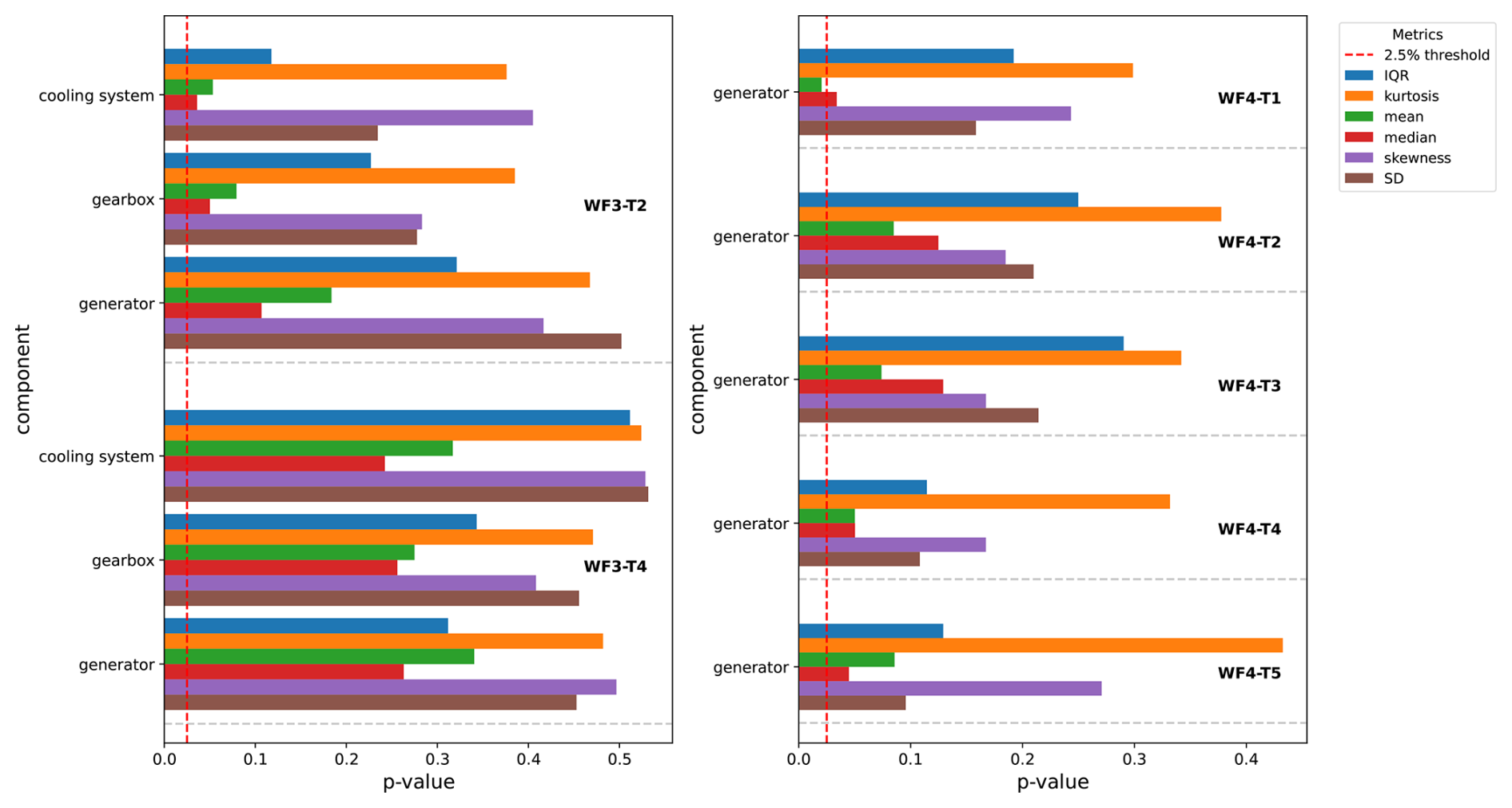 Figure 9Figure shows for several turbine components, i.e., cooling system, gearbox, and generator for wind farm 3 (left subfigure) and generator for wind farm 4 (right subfigure), the mean of the p values of the KS tests for several distribution-describing metrics, i.e., interquartile range (IQR), kurtosis, mean, median, skewness, and standard deviation (SD). The mean is determined as the average of the p values of the KS tests of the temperature signals that are related to the component (see Tables A3 and A4). The red dotted vertical line indicates the 2.5 % threshold (threshold that separates significant from insignificant evidence against the null hypothesis). The longer the bars, the more similar the metrics are for the reconstruction errors of the signals generated in windows with and without sensor errors. The x axis shows the p values for the different metrics and components. The y axis indicates the component. The colors indicate the metric.