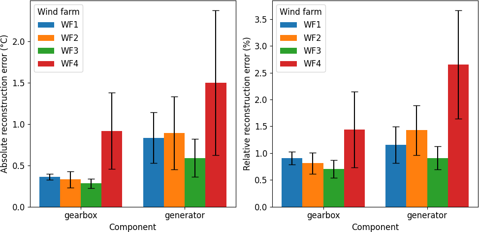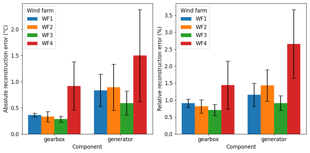 Figure 10Overview of the absolute reconstruction errors in °C (left plot) and relative reconstruction errors in % (right plot) generated by the model. Each bar color indicates a certain wind farm. The bars are grouped per machine component. The size of the bar indicates the average of the absolute reconstruction errors of the different signals related to the specific component (i.e., gearbox or generator). The whiskers on top of each bar indicate the SD of the average of absolute reconstruction errors of the different signals related to the component.