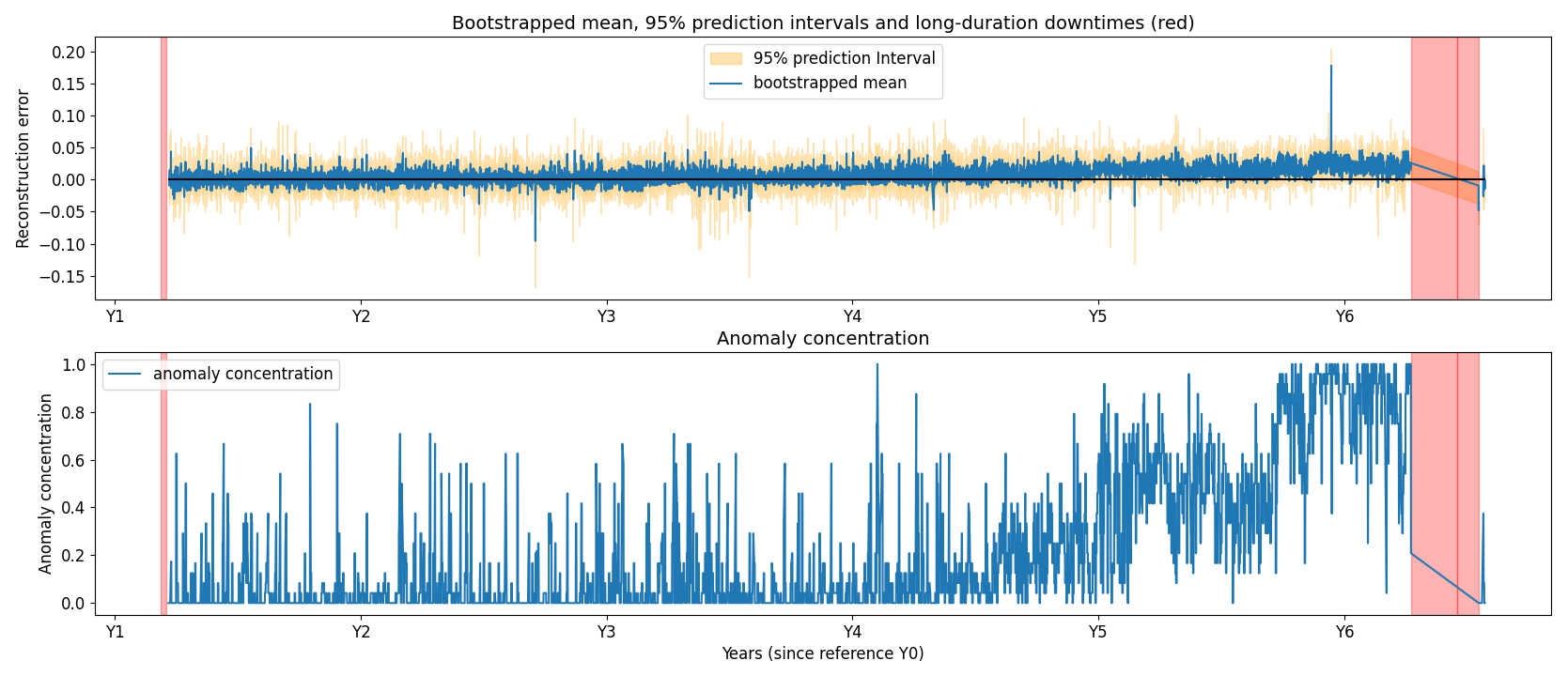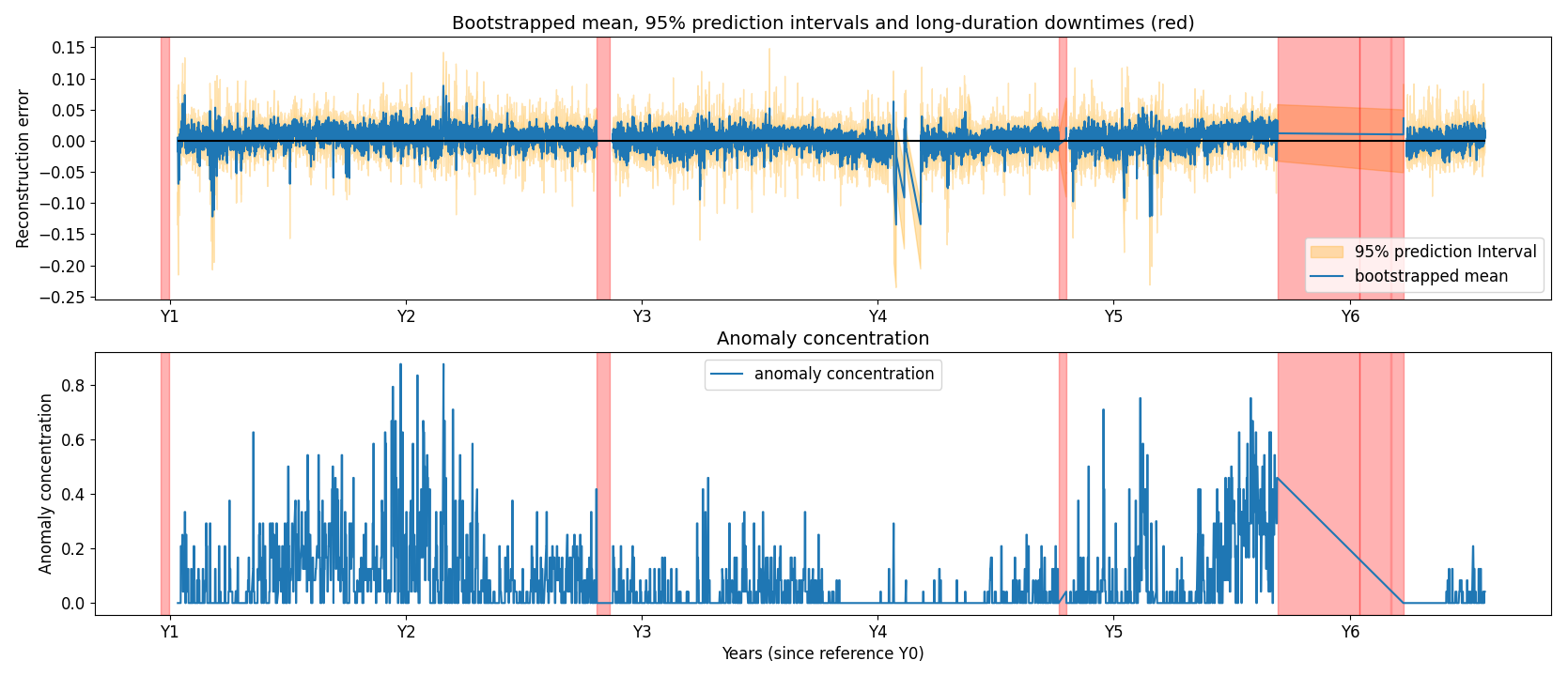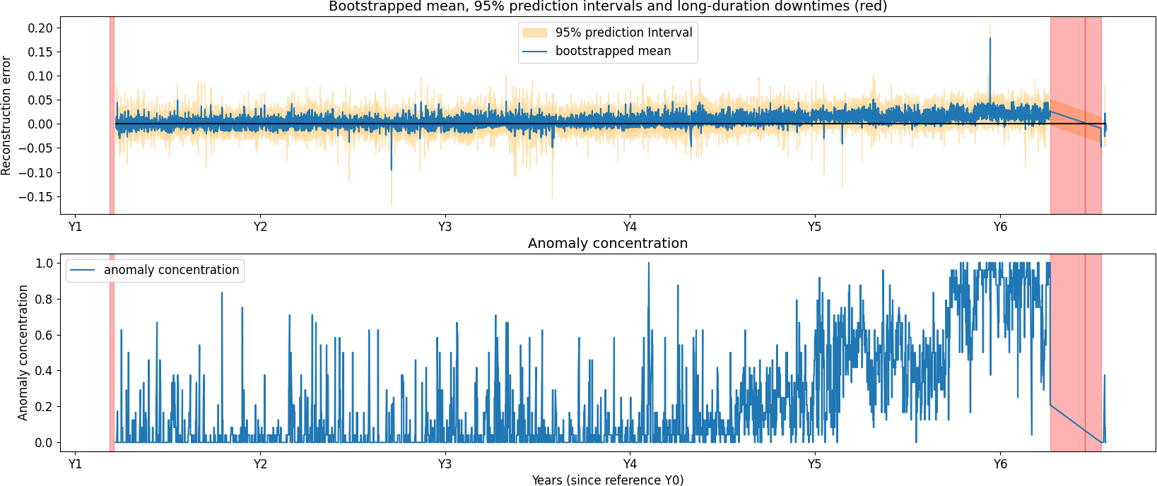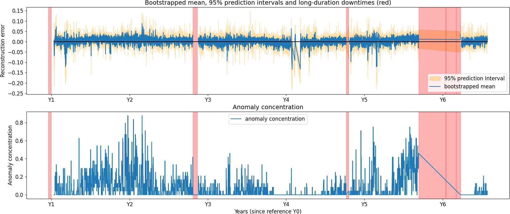 In Fig. 11, a gradual degradation trend is visible in the anomaly concentration for the generator phase 2 temperature. The trend starts approximately 18 months prior to the failure, which occurred at year 6.25. In Fig. 12, temperatures in the gearbox RE main bearing begin to rise around year 5.5, followed by failure at year 5.75. The detection lead time varies substantially across failures, influenced by many factors that are not always observable. In both of these cases, the model identifies the degradation well in advance. The figure also includes several long-duration downtimes unrelated to the gearbox; these are not detected when using gearbox signals, as the associated failure modes are not gearbox related. In Fig. 12 the anomaly concentration metric also rises around Y2. It is unclear what causes this. There is no evidence that it is caused by seasonal fluctuations since this would also be visible in the following years. An analysis of the event is ongoing.
