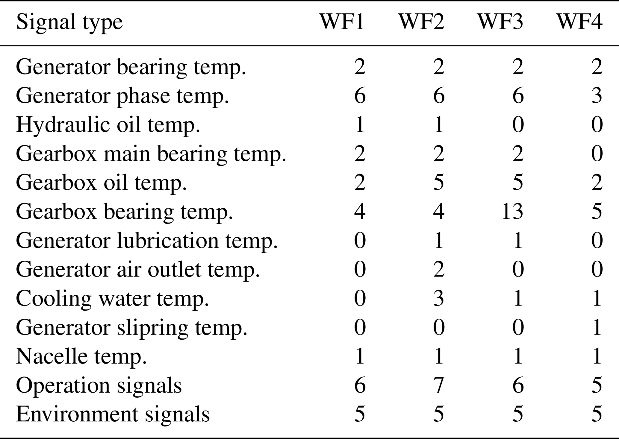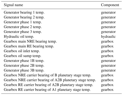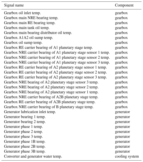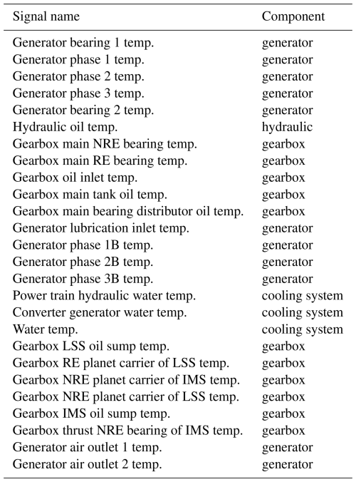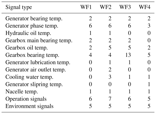 This study uses 10 min SCADA data from four operational offshore wind farms (WF1–WF4). The dataset spans three wind turbine types with rated capacities between 3 MW (megawatt) and 10 MW. Across the four wind farms, 136 turbines are included, representing an aggregated observation period of approximately 1000 turbine years. The SCADA data provide measurements of component temperatures and environmental and operational conditions. Only a subset of these signals is used in this work. Table 1 provides an aggregated overview, with detailed signal lists presented in Tables A1, A2, A3, and A4. The primary focus of this research is on detecting abnormal behavior in temperature-related signals under the condition that sensor errors can occur. These anomalies may serve as precursors to component failures.